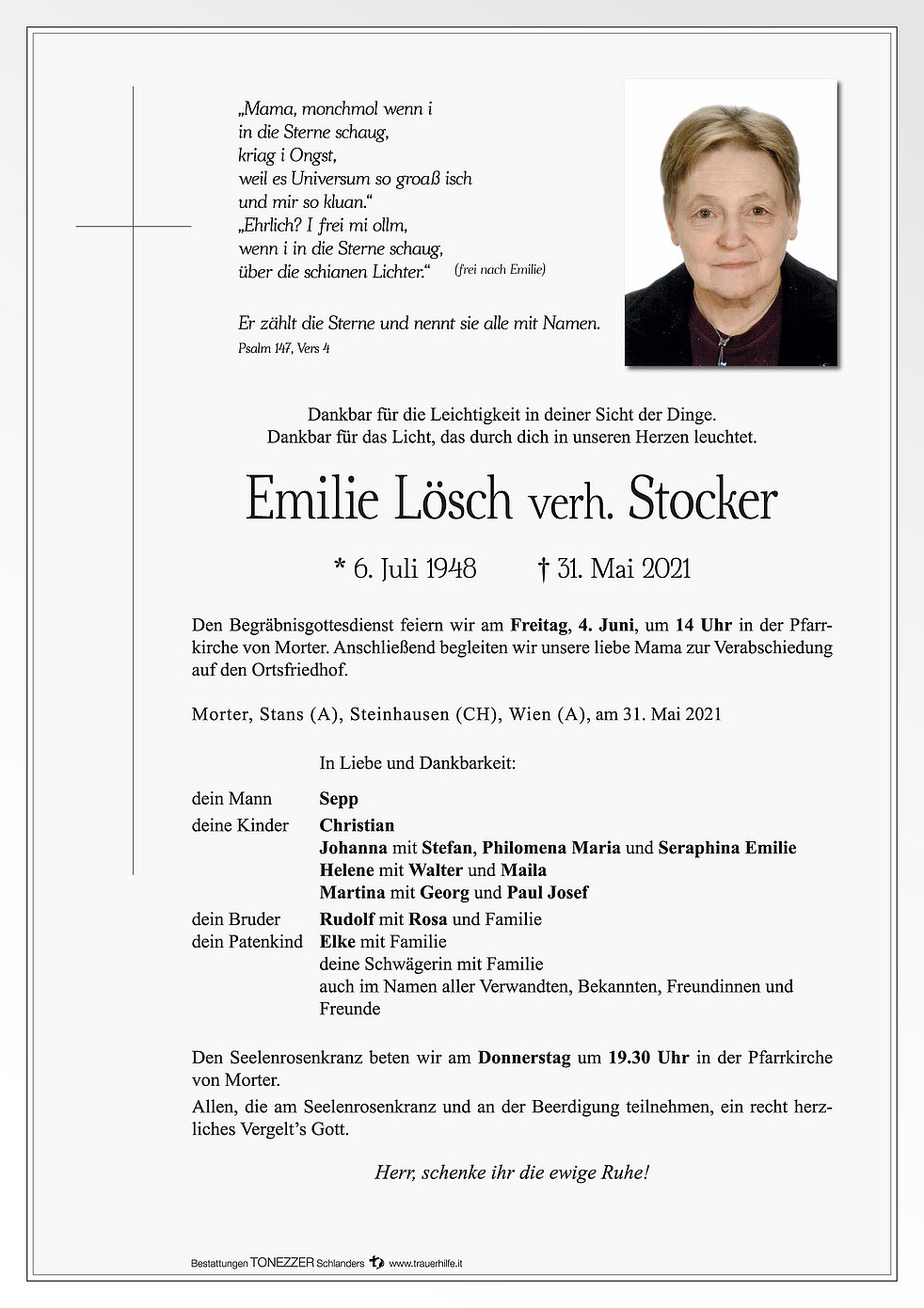 Den Begräbnisgottesdienst feiern wir am Freitag, 4. Juni, um 14 Uhr in der Pfarrkirche von Morter.
