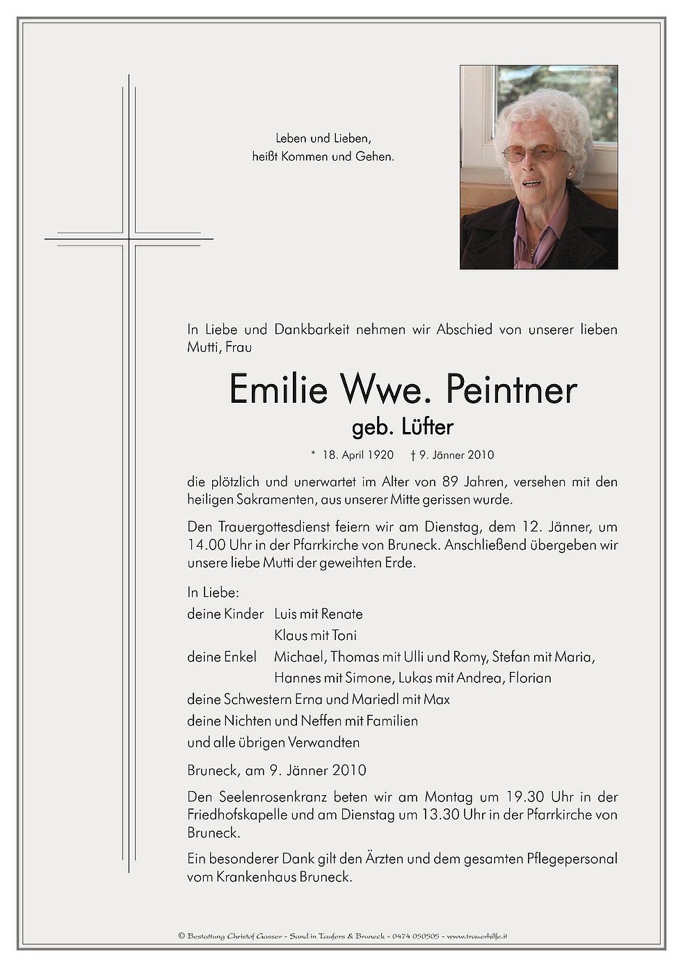 Den Trauergottesdienst feiern wir am Dienstag, dem 12. Jänner, um 14.00 Uhr in der Pfarrkirche von Bruneck. Anschließend übergeben wir unsere liebe Mutti der geweihten Erde.