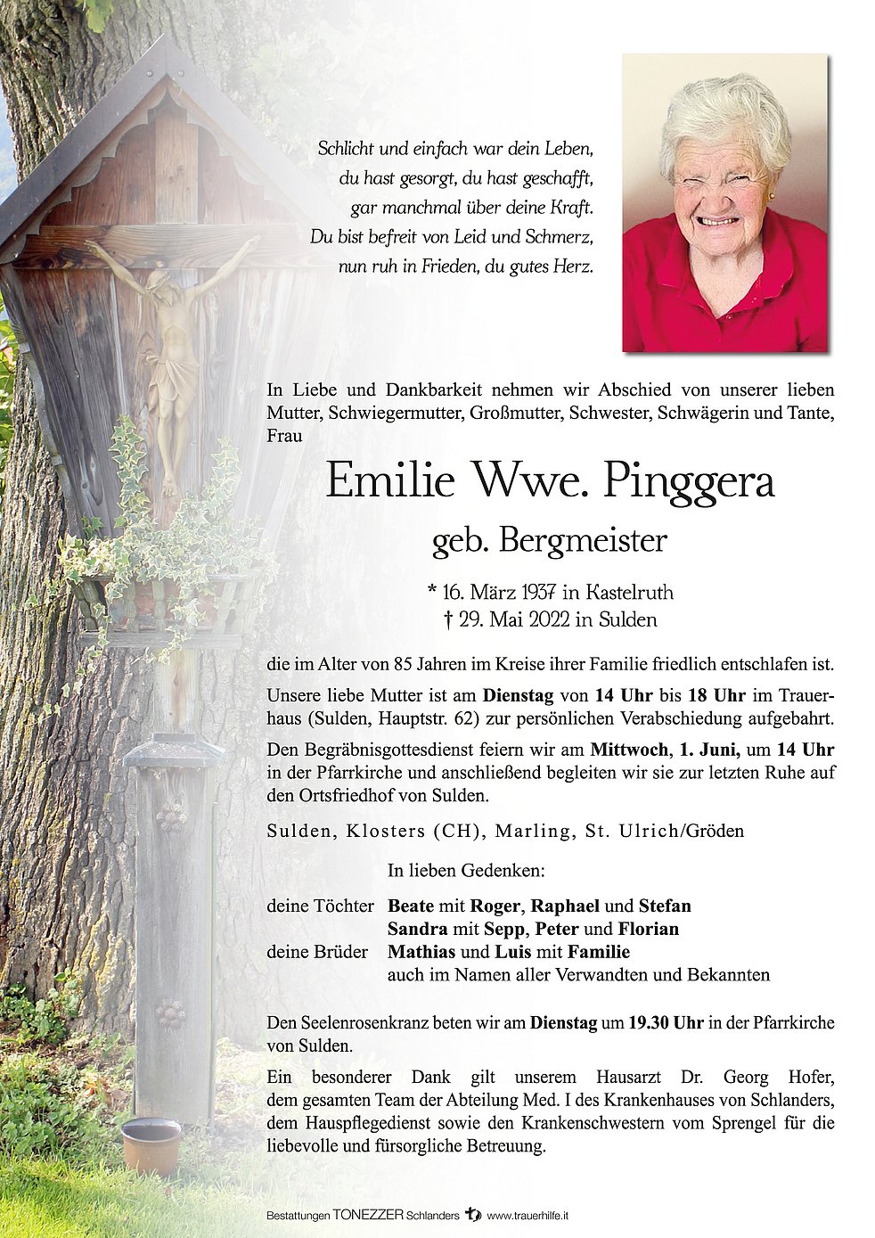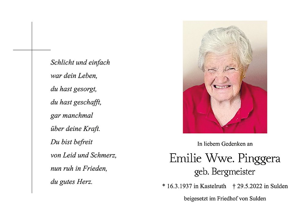 Den Begräbnisgottesdienst feiern wir am Mittwoch, 1. Juni, um 14 Uhr in der Pfarrkirche und anschließend begleiten wir sie zur letzten Ruhe auf den Ortsfriedhof von Sulden.