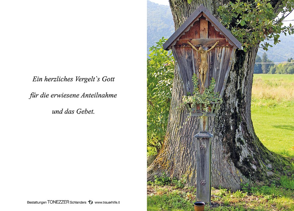 Ein besonderer Dank gilt unserem Hausarzt Dr. Georg Hofer, dem gesamten Team der Abteilung Med. I des Krankenhauses von Schlanders, dem Hauspflegedienst sowie den Krankenschwestern vom Sprengel für die liebevolle und fürsorgliche Betreuung.