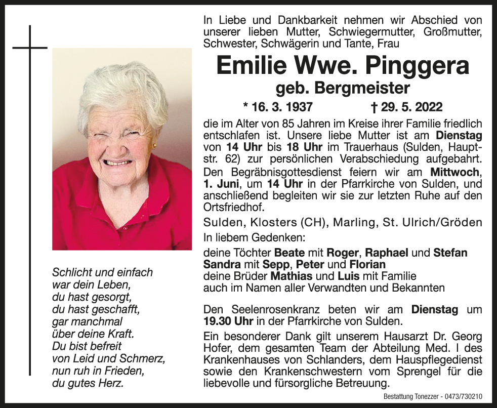 Unsere liebe Mutter ist am Dienstag von 14 Uhr bis 18 Uhr im Trauerhaus (Sulden, Hauptstr. 62) zur persönlichen Verabschiedung aufgebahrt.