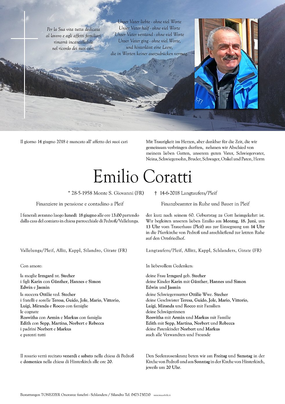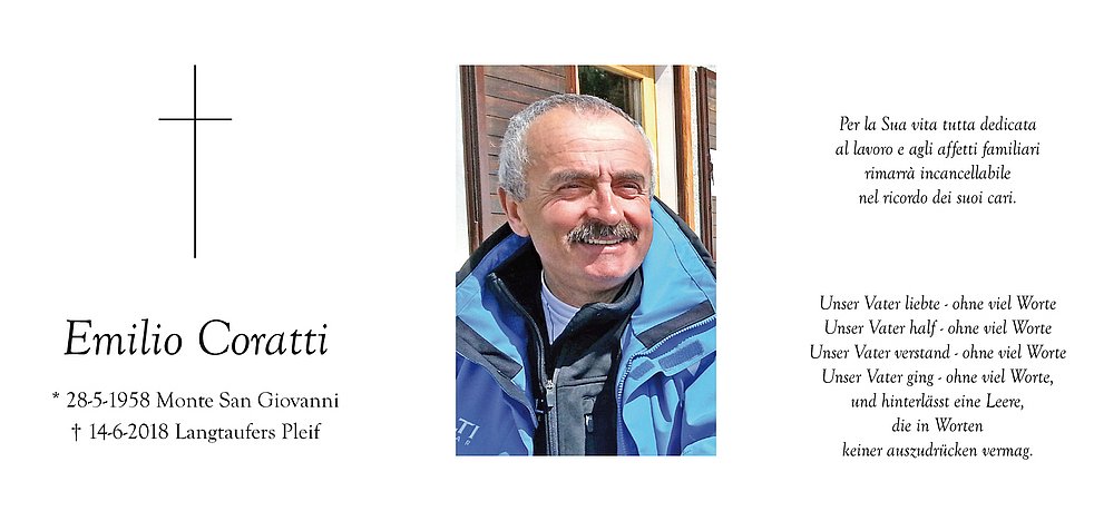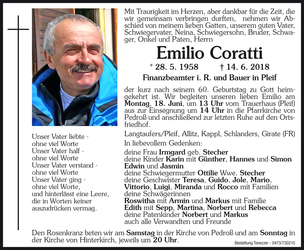 der kurz nach seinem 60. Geburtstag zu Gott heimgekehrt ist. Wir begleiten unseren lieben Emilio am Montag, 18. Juni, um 13 Uhr vom Trauerhaus (Pleif) aus zur Einsegnung um 14 Uhr in die Pfarrkirche von Pedroß und anschließend zur letzten Ruhe auf den Ortsfriedhof.