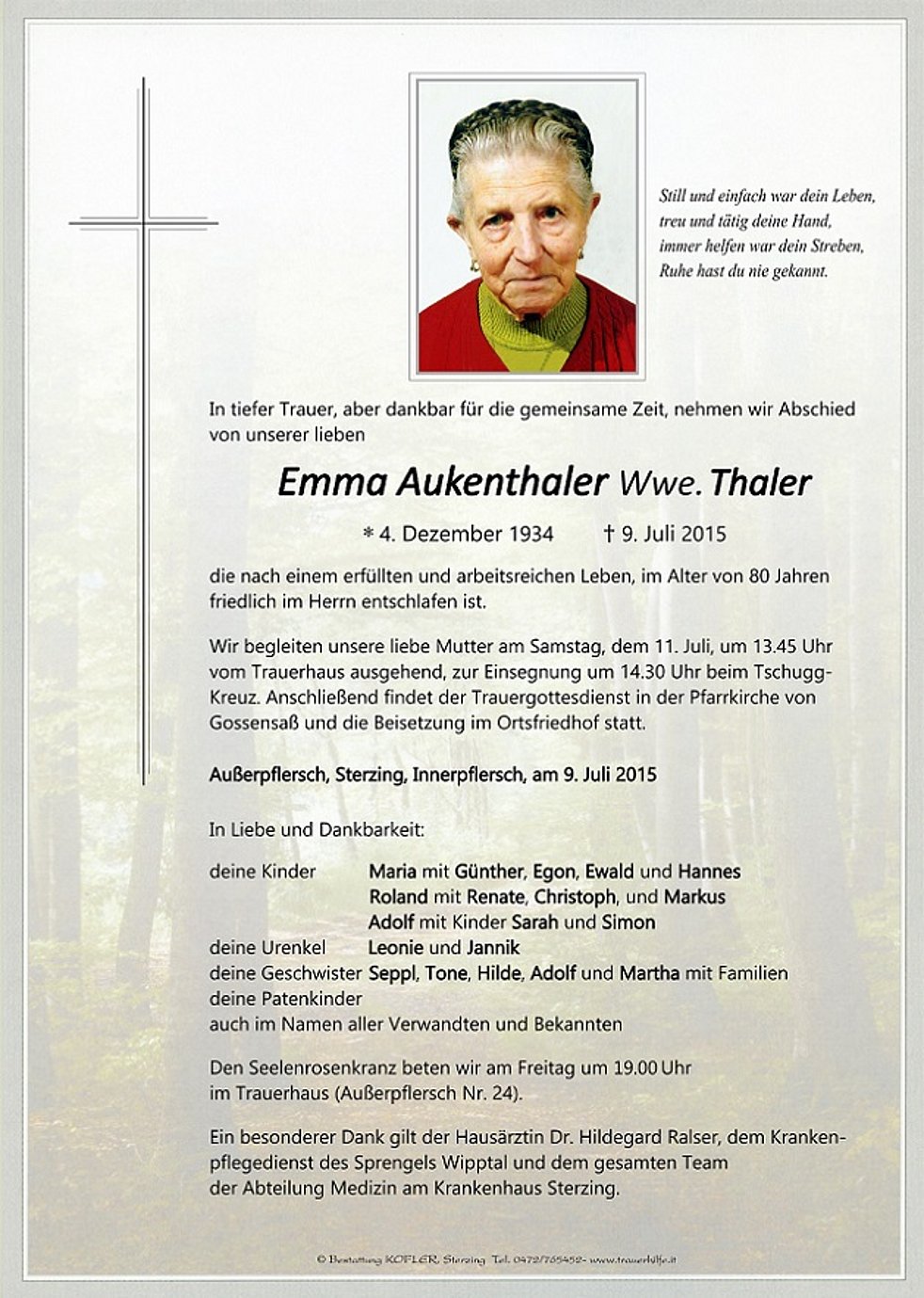 vom Trauerhaus ausgehend, zur Einsegnung um 14.30 Uhr beim Tschugg-Kreuz. Anschließend findet der Trauergottesdienst in der Pfarrkirche von Gossensaß