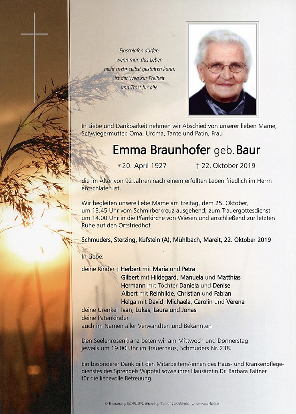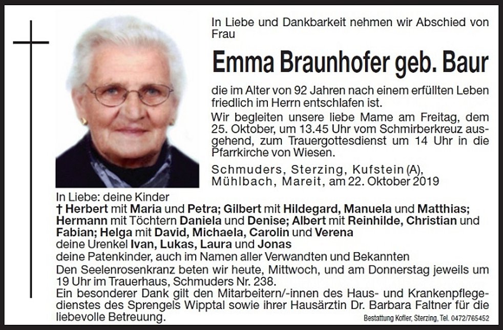 Wir begleiten unsere liebe Mame am Freitag, dem 25. Oktober, um 13.45 Uhr vom Schmirberkreuz ausgehend, zum Trauergottesdienst um 14.00 Uhr in die Pfarrkirche von Wiesen und anschließend zur letzten Ruhe auf den Ortsfriedhof.