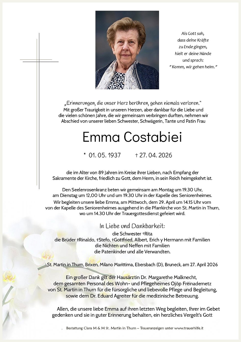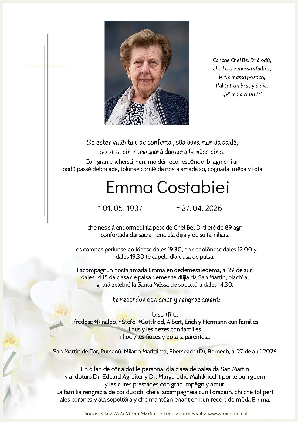 Al ê dagnora bël da gni jö da te y dala Rita,bël pro porta sentin n bun tof da pan,Keks o Kränze frësches o pices scleurnaries al ê beliscimi ricordi.Na parora na matada mo dagnora se sentin begnödüs.