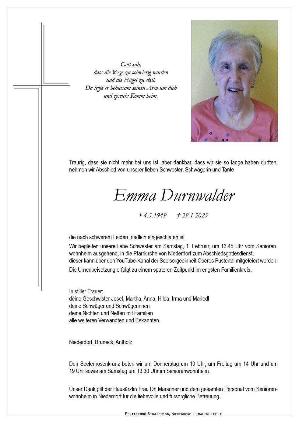 Trauerfeier: 01.02. - 14:00 Uhr Niederdorf