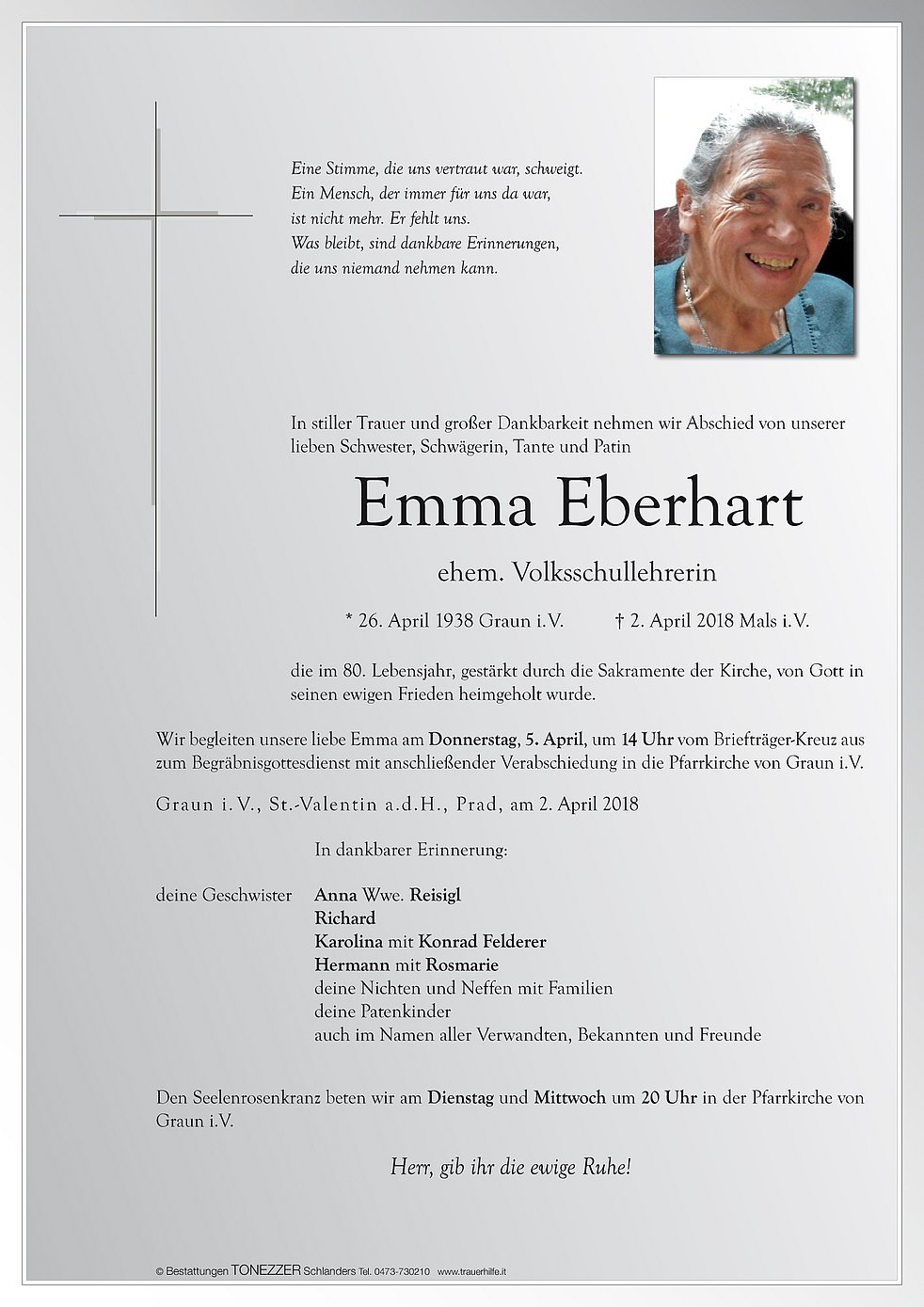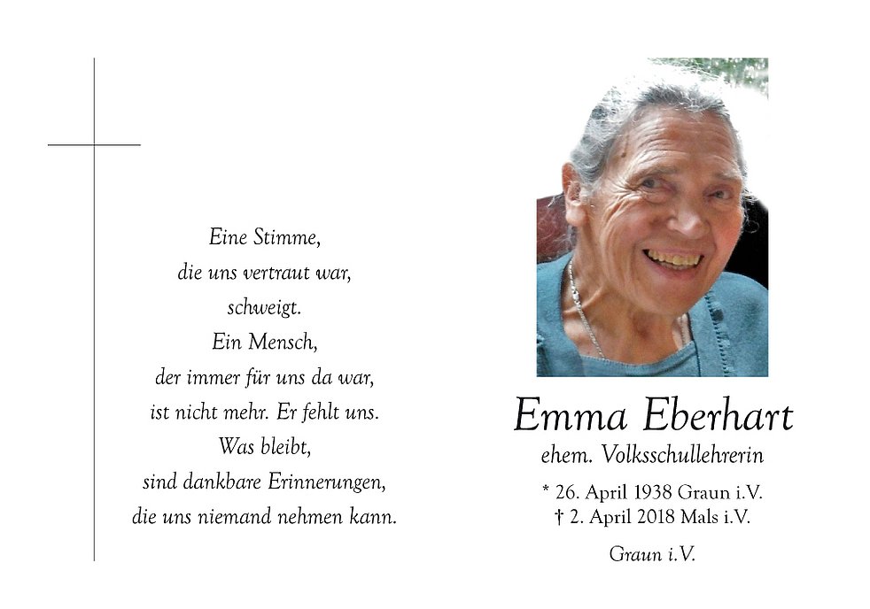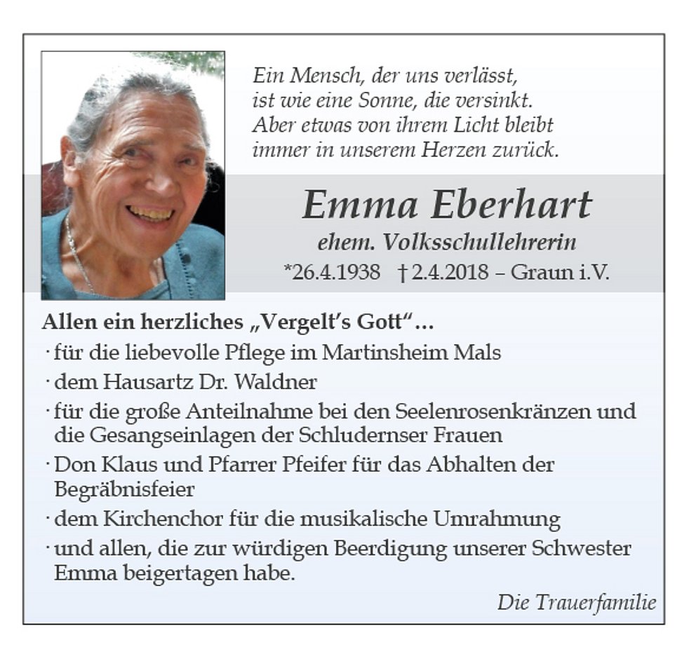 Wir begleiten unsere liebe Emma am Donnerstag, 5. April, um 14 Uhr vom Briefträger-Kreuz aus zum Begräbnisgottesdienst mit anschließender Verabschiedung in die Pfarrkirche von Graun i.V.