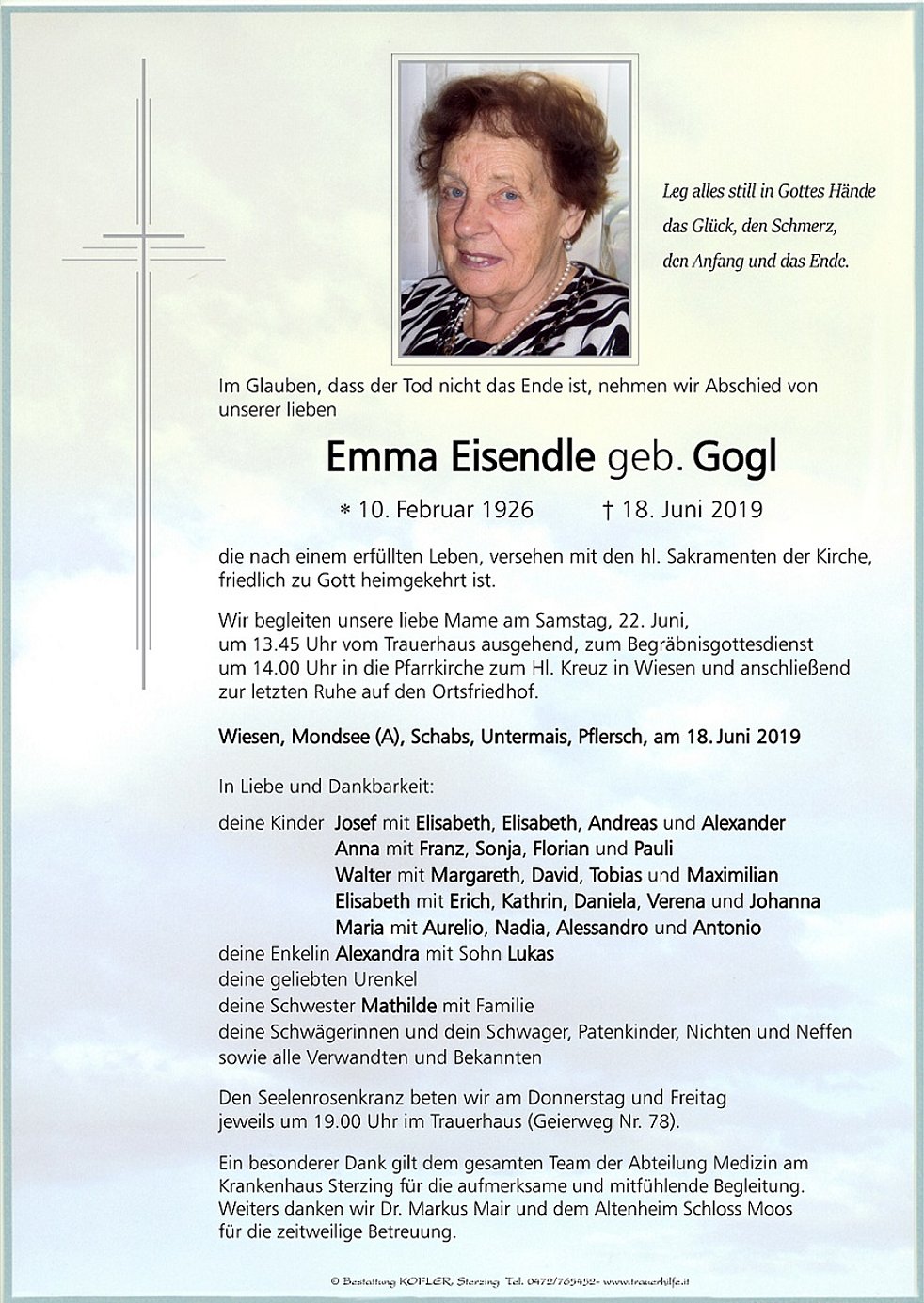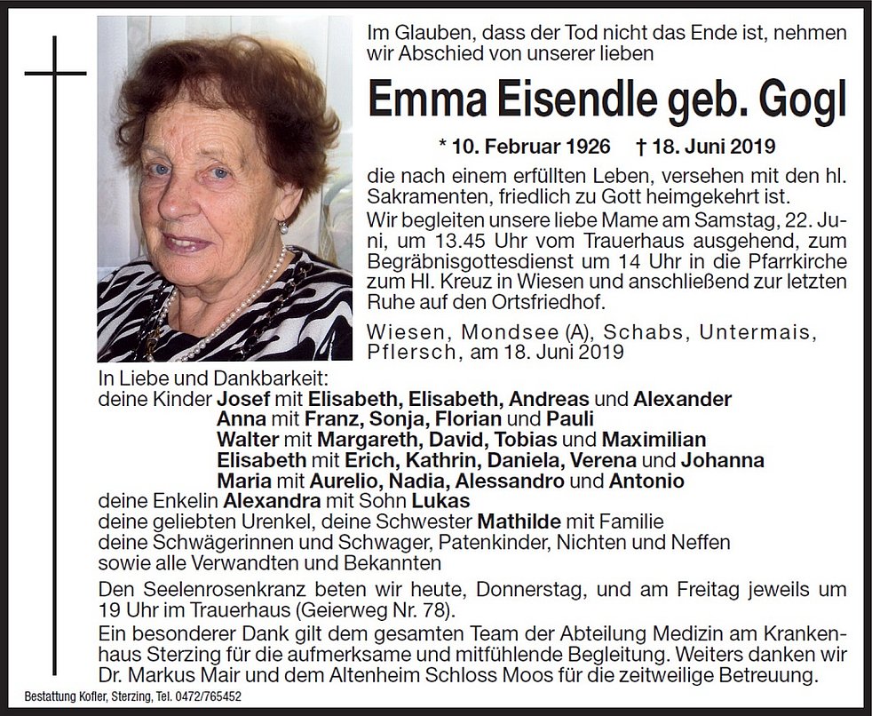 Wir begleiten unsere liebe Mame am Samstag, 22. Juni, um 13.45 Uhr vom Trauerhaus ausgehend, zum Begräbnisgottesdienst um 14.00 Uhr in die Pfarrkirche zum Hl. Kreuz in Wiesen und anschließend zur letzten Ruhe auf den Ortsfriedhof.