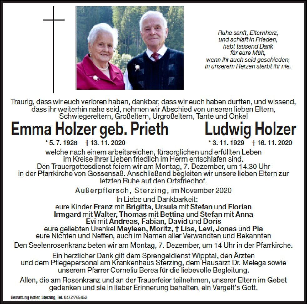 Den Trauergottesdienst feiern wir am Montag, 7. Dezember, um 14.30 Uhr in der Pfarrkirche von Gossensaß. Anschließend begleiten wir unsere liebe Mutter zur letzten Ruhe auf den Ortsfriedhof.