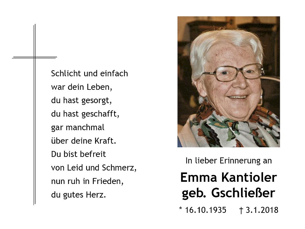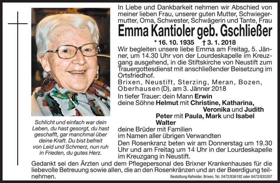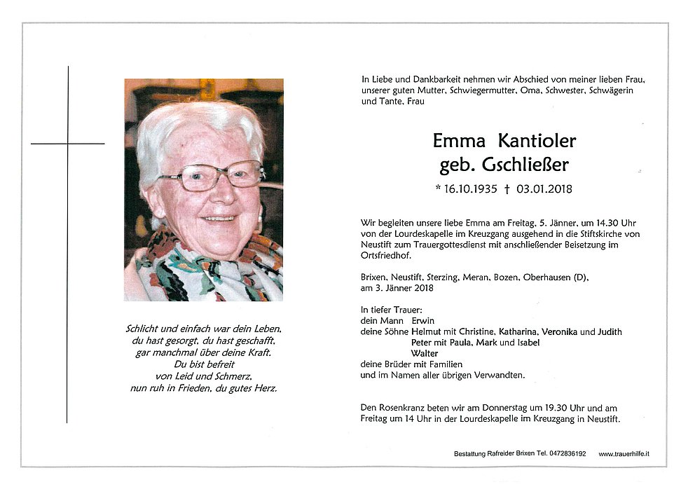 Wir begleiten unsere liebe Emma am Freitag, 5. Jänner, um 14.30 Uhr von der Lourdeskapelle im Kreuzgang ausgehend in die Stiftskirche von Neustift zum Trauergottesdienst mit anschließender Beisetzung im Ortsfriedhof.