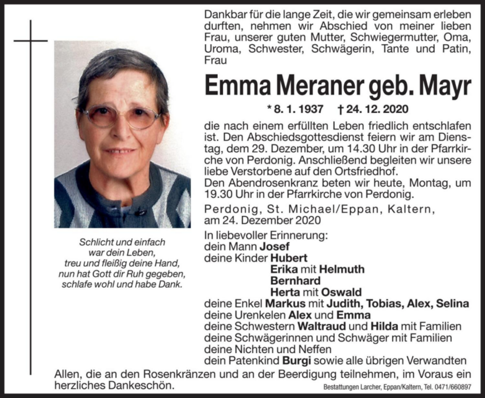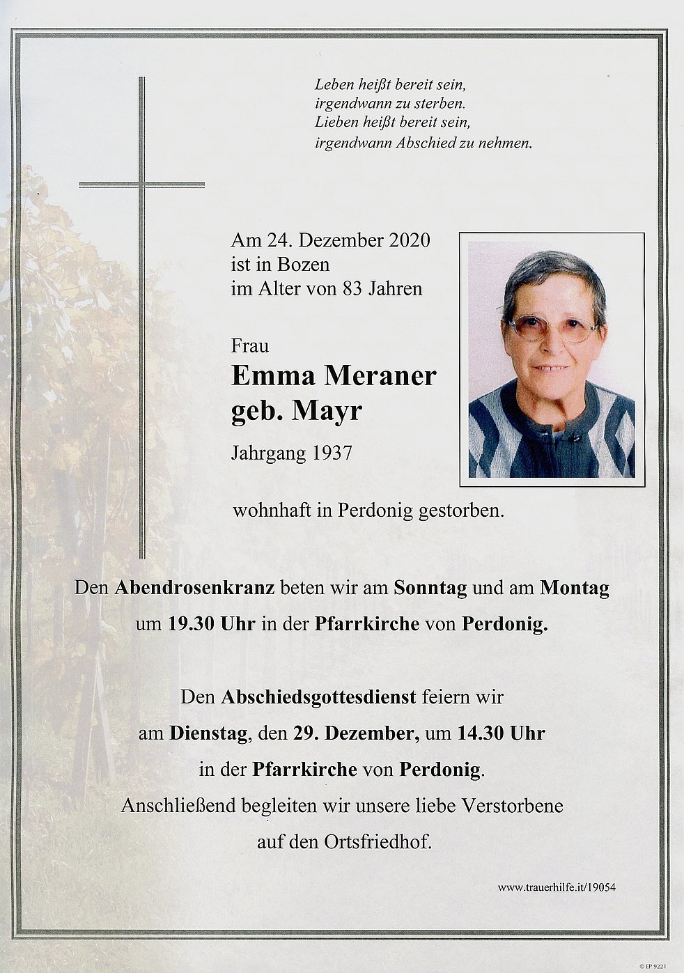 Den Abschiedsgottesdienst feiern wir am Dienstag, dem 29. Dezember um 14.30 Uhr in der Pfarrkirche von Perdonig. Anschließend begleiten wir unsere liebe Verstorbene auf den Ortsfriedhof.