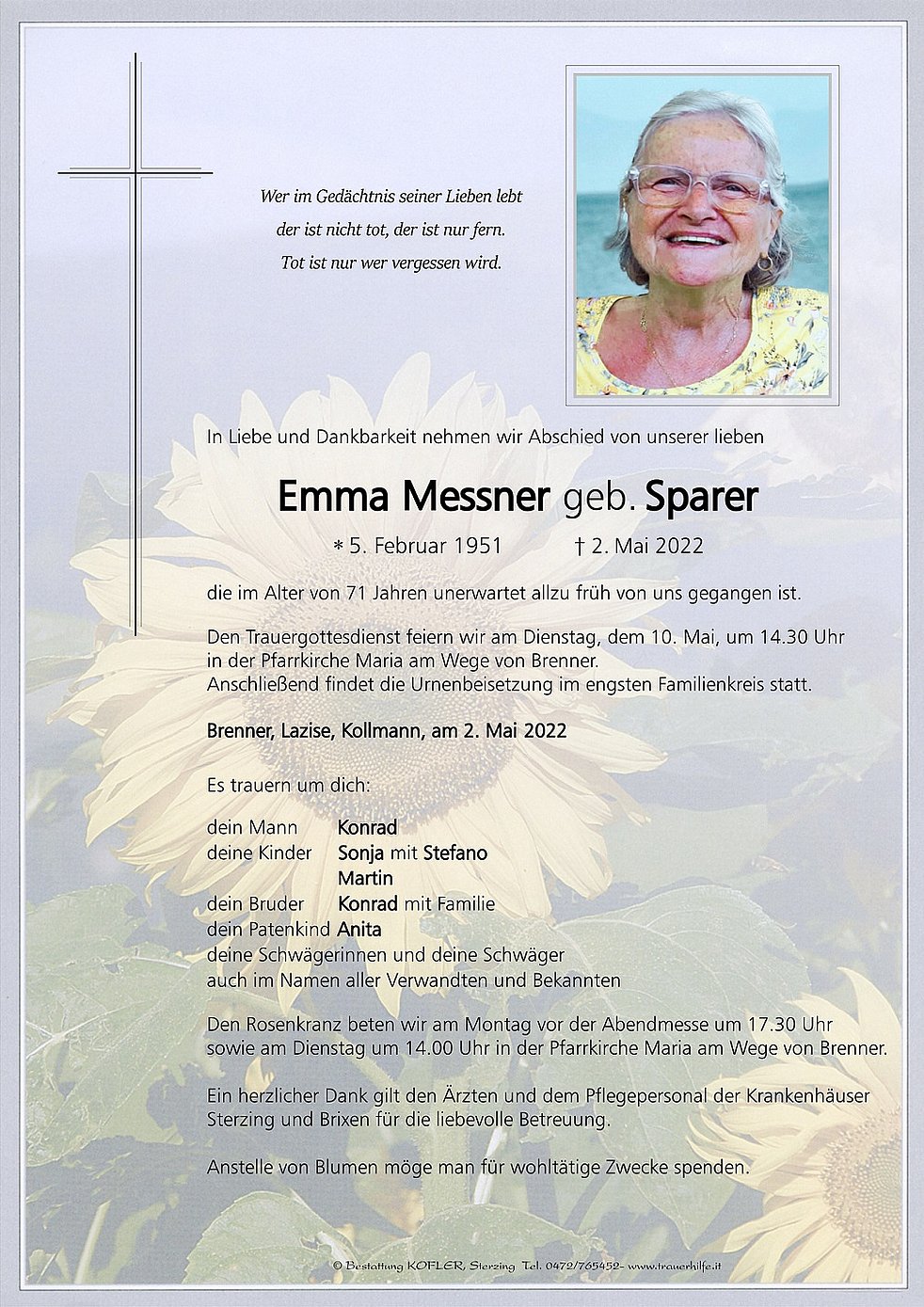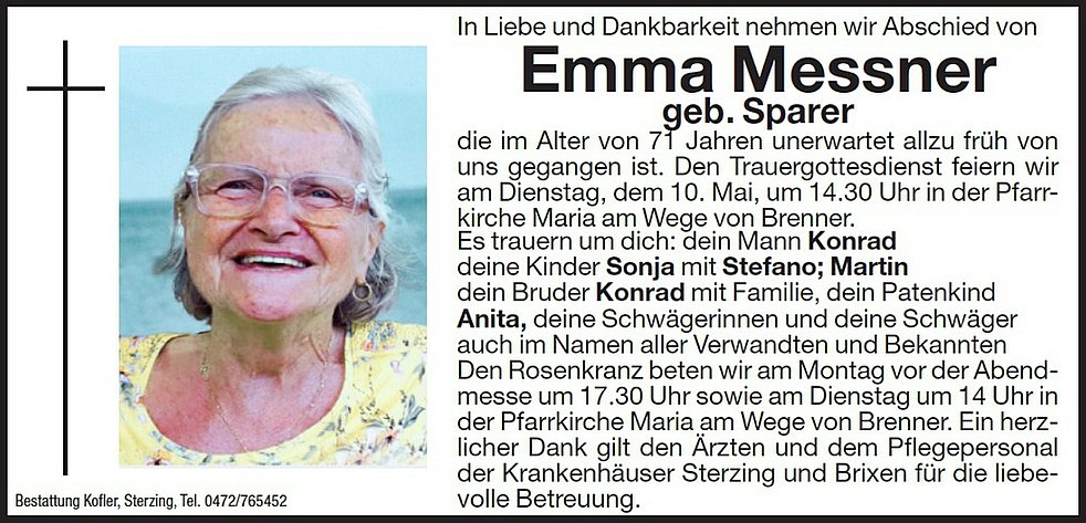 Den Trauergottesdienst feiern wir am Dienstag, dem 10. Mai, um 14.30 Uhr in der Pfarrkirche Maria am Wege von Brenner. Anschließend findet die Urnenbeisetzung im engsten Familienkreis statt.