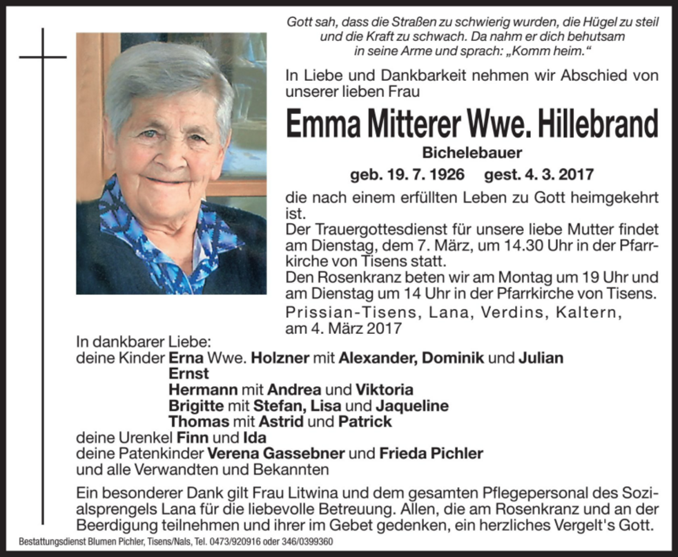 Der Trauergottesdienst für unsere liebe Mutter findet am Dienstag, den 07. März um 14.30 Uhr in der Pfarrkirche von Tisens statt. Den Rosenkranz beten wir am Sonntag und Montag um