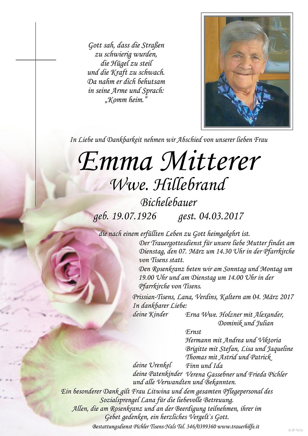Ein besonderer Dank gilt Frau Litwina und dem gesamten Pflegepersonal des Sozialsprengel Lana für die liebevolle Betreuung. Allen, die am Rosenkranz und an der Beerdigung teilnehmen, ihrer im