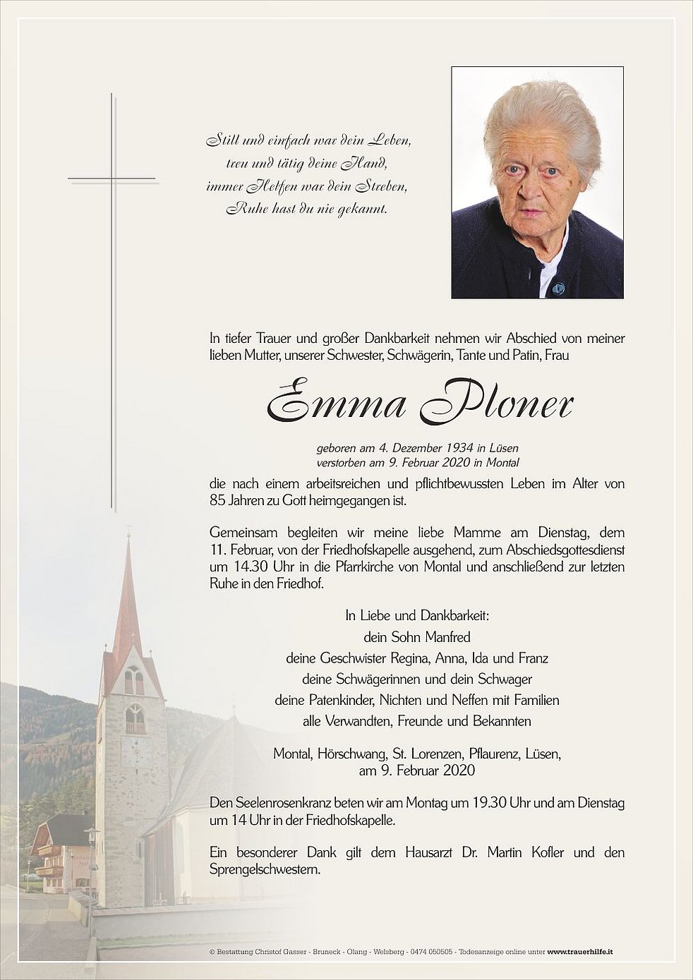 Gemeinsam begleiten wir meine liebe Mamme am Dienstag, dem 11. Februar, von der Friedhofskapelle ausgehend, zum Abschiedsgottesdienst um 14.30 Uhr in die Pfarrkirche von Montal und anschließend zur letzten Ruhe in den Friedhof.