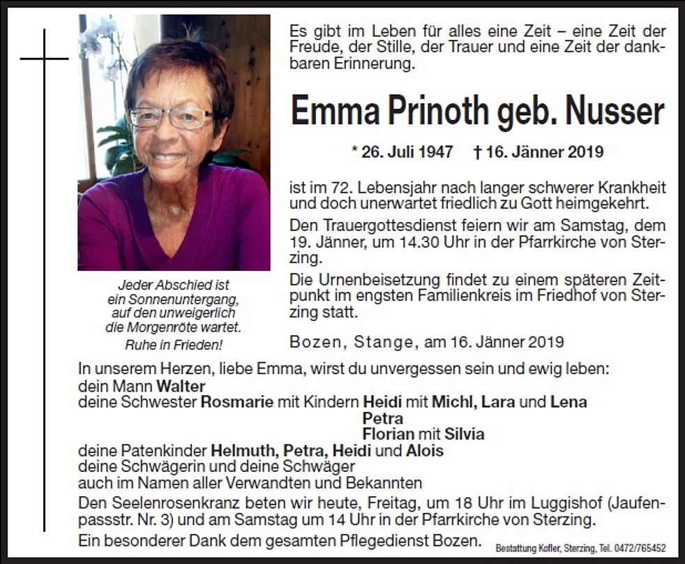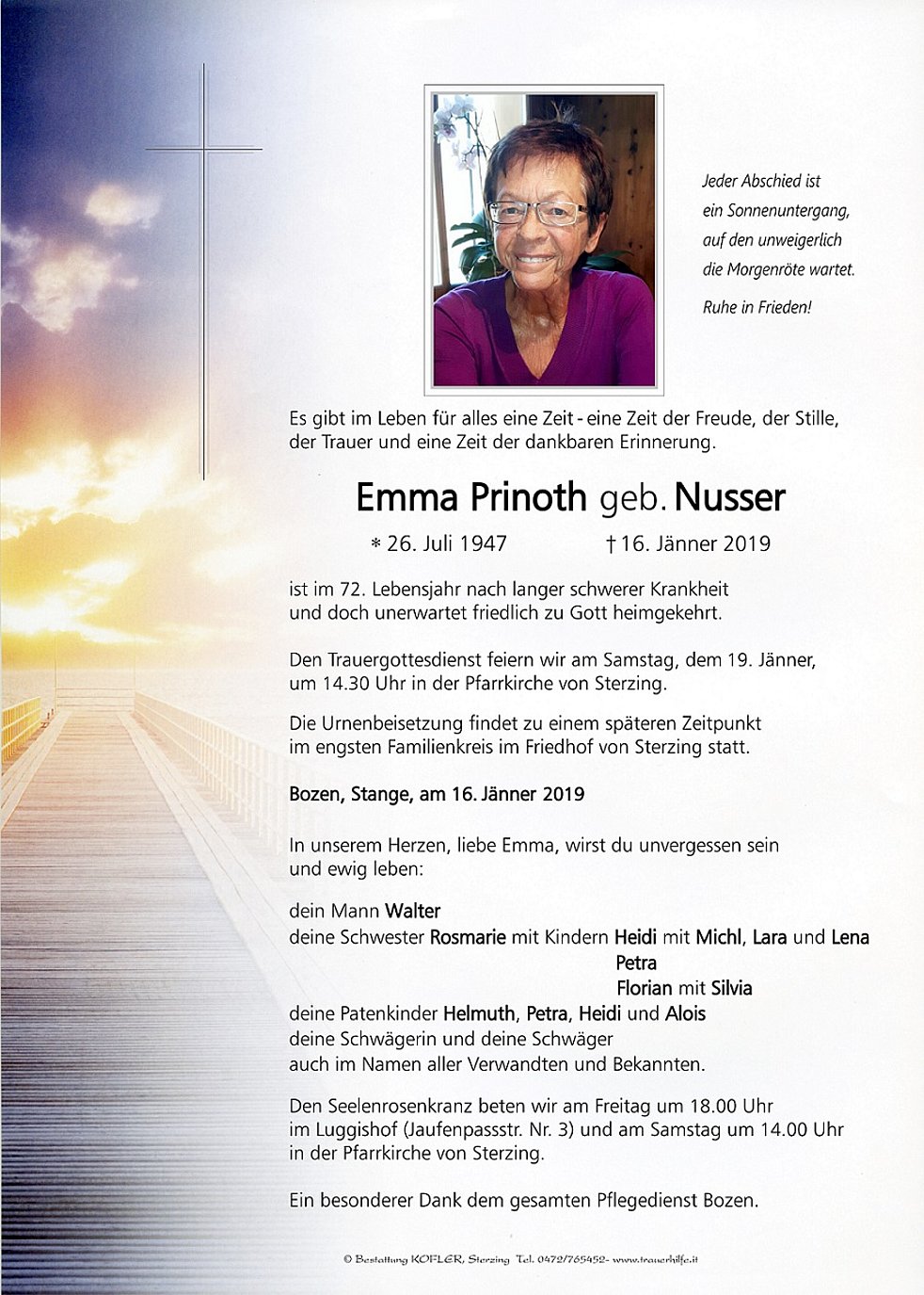 Die Urnenbeisetzung findet zu einem späteren Zeitpunkt im engsten Familienkreis im Friedhof von Sterzing statt.
