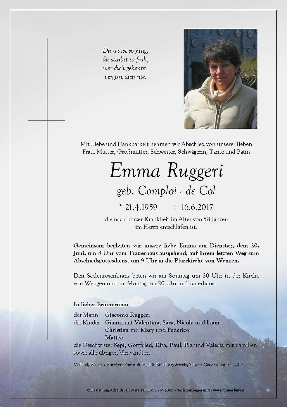 Gemeinsam begleiten wir unsere liebe Emma am Dienstag, dem 20. Juni, um 8 Uhr vom Trauerhaus ausgehend, auf ihrem letzten Weg zum Abschiedsgottesdienst um 9 Uhr in die Pfarrkirche von Wengen.