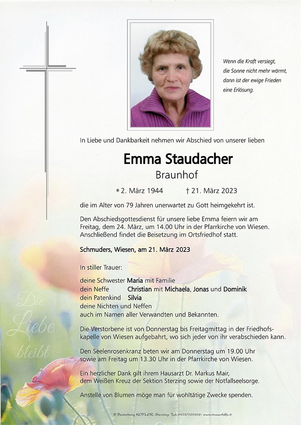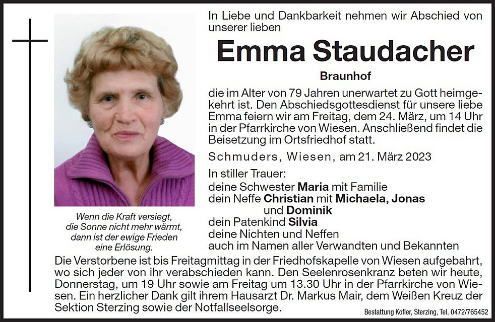 Den Abschiedsgottesdienst für unsere liebe Emma feiern wir am Freitag, dem 24. März, um 14.00 Uhr in der Pfarrkirche von Wiesen. Anschließend findet die Beisetzung im Ortsfriedhof statt.