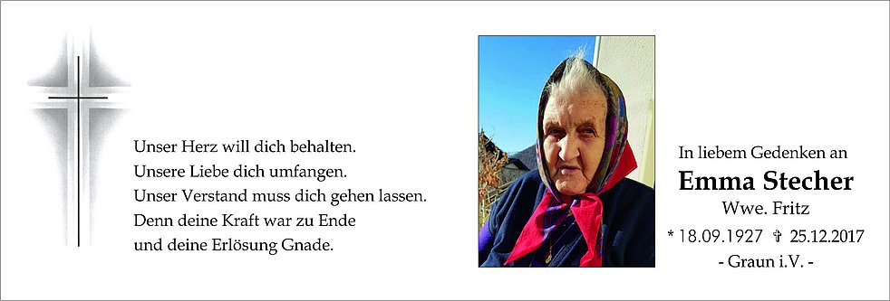Wir begleiten unsere liebe Mama am Mittwoch, 27. Dezember, um 14 Uhr vom Briefträger-Kreuz aus zum Trauergottesdienst in die Pfarrkirche und anschließend zur Beisetzung auf den Friedhof von Graun i.V.