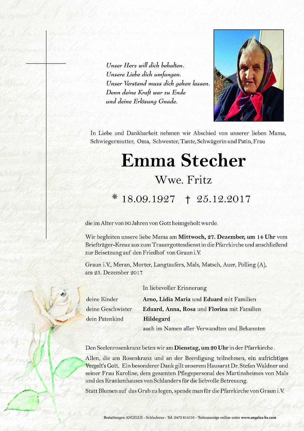 Allen, die am Rosenkranz und an der Beerdigung teilnehmen, ein aufrichtiges Vergelt's Gott. Ein besonderer Dank gilt unserem Hausarzt Dr. Stefan Waldner und seiner Frau Karoline, dem gesamten Pflegepersonal des Martinsheimes von Mals und des Krankenhauses von Schlanders für die liebvolle Betreuung.