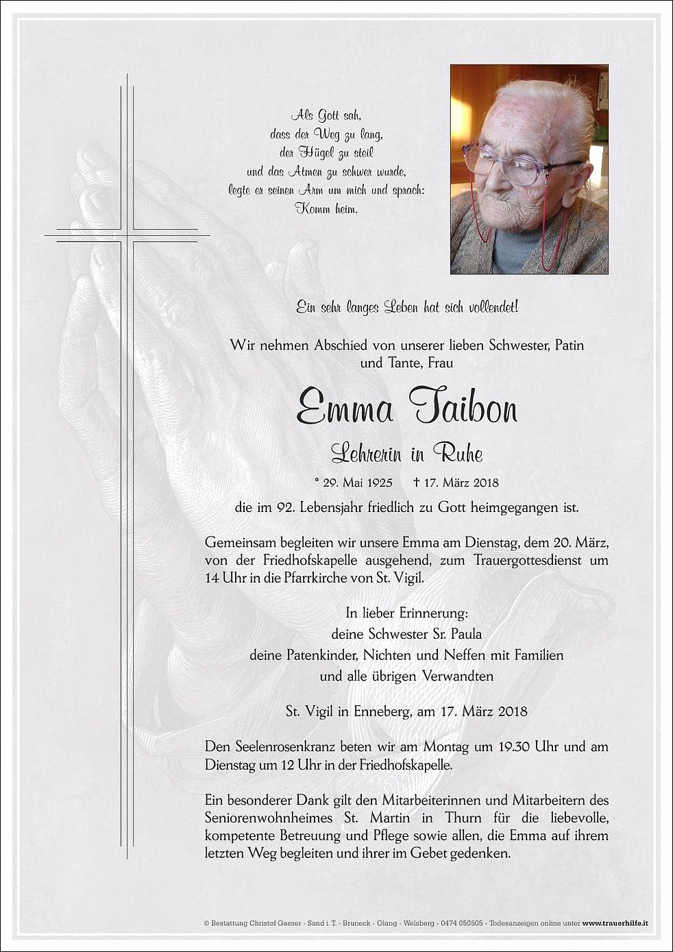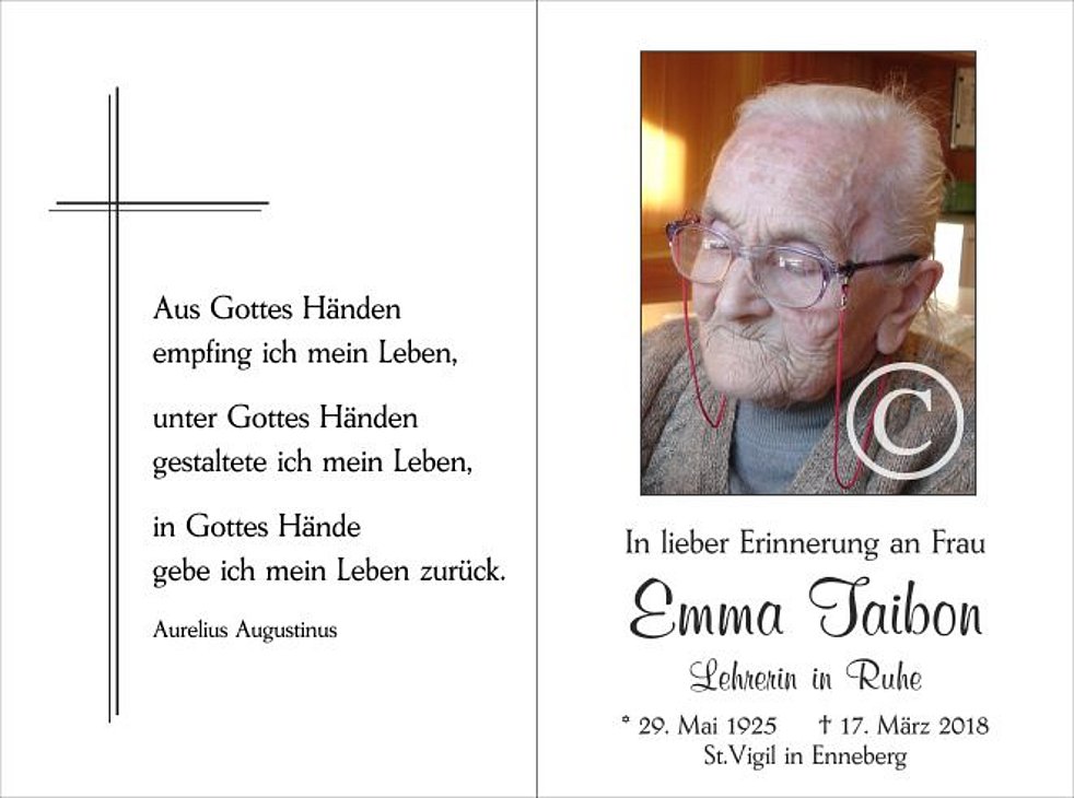 Ein besonderer Dank gilt den Mitarbeiterinnen und Mitarbeitern des Seniorenwohnheimes St. Martin in Thurn für die liebevolle, kompetente Betreuung und Pflege sowie allen, die Emma auf ihrem letzten Weg begleiten und ihrer im Gebet gedenken.