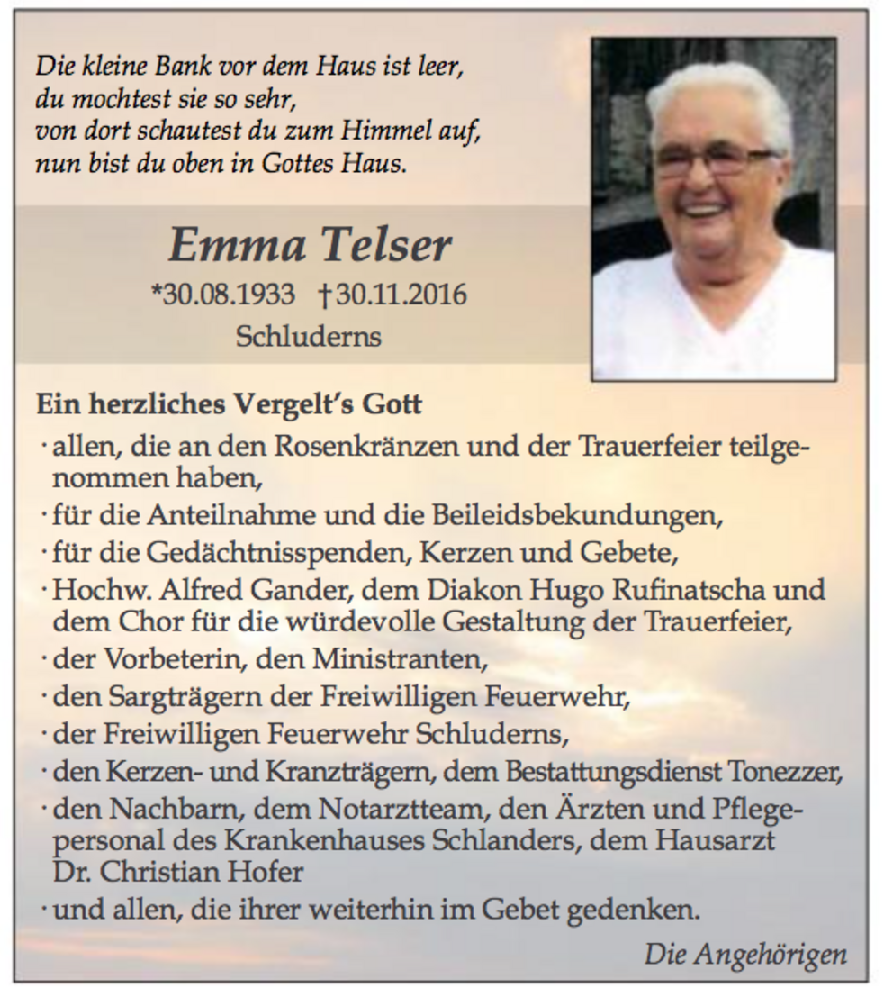 und dem gesamten Pflegepersonal des Krankenhauses von Schlanders für die liebevolle Betreuung.
