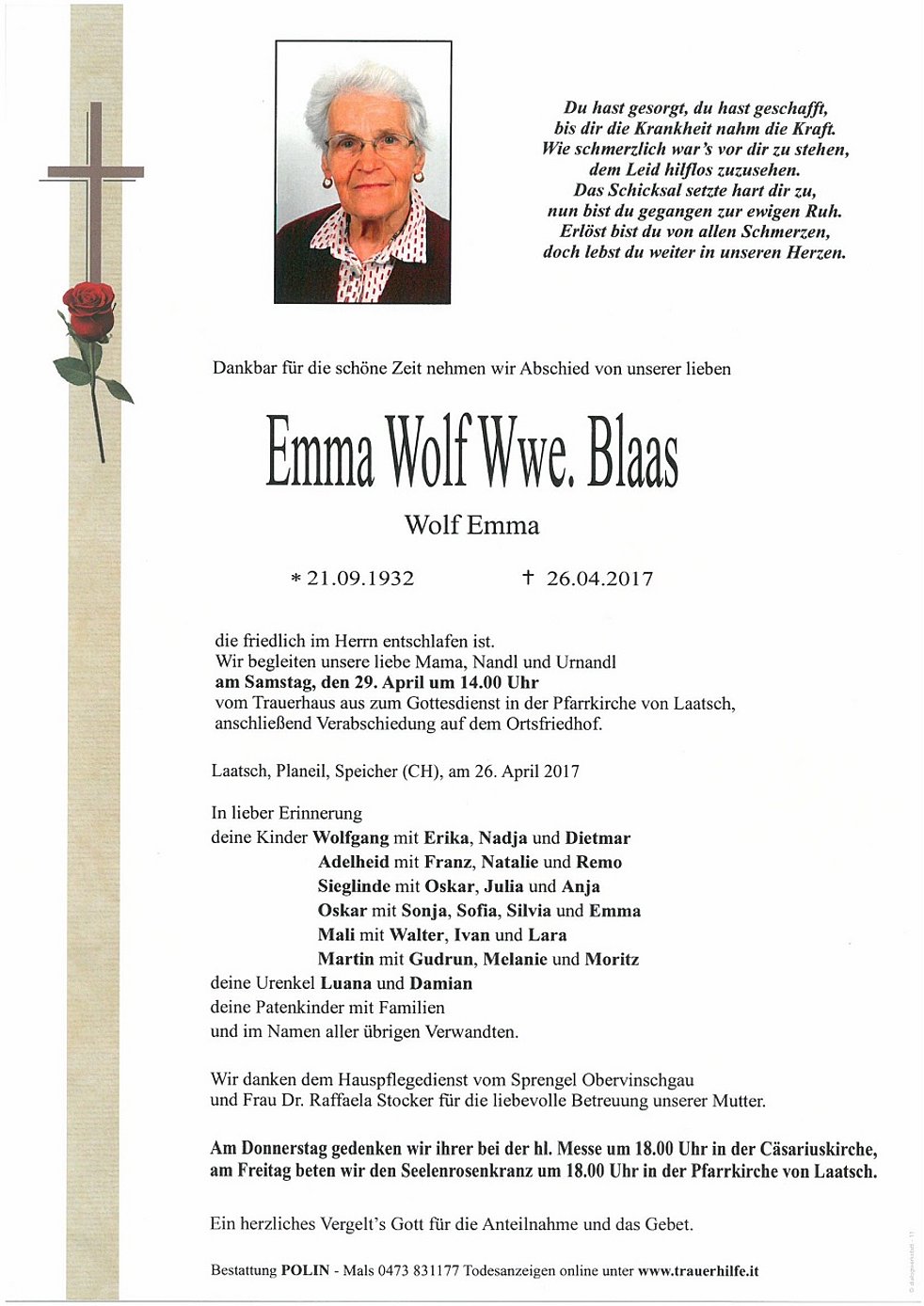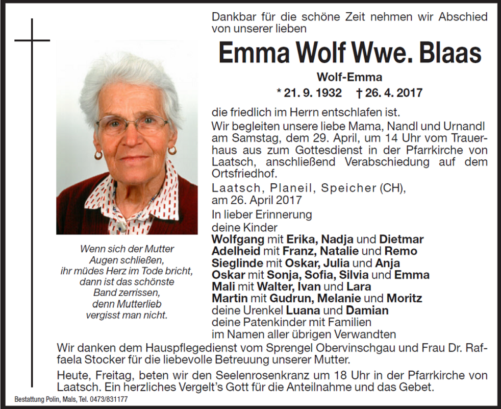 Wir begleiten unsere liebe Mama, Nandl und Urnandl am Samstag, den 29. April um 14.00 Uhr vom Trauerhaus aus zum Gottesdienst in der Pfarrkirche von Laatsch, anschließend Verabschiedung auf dem Ortsfriedhof.
