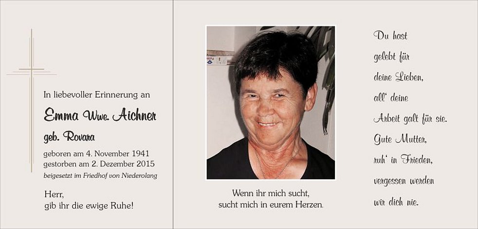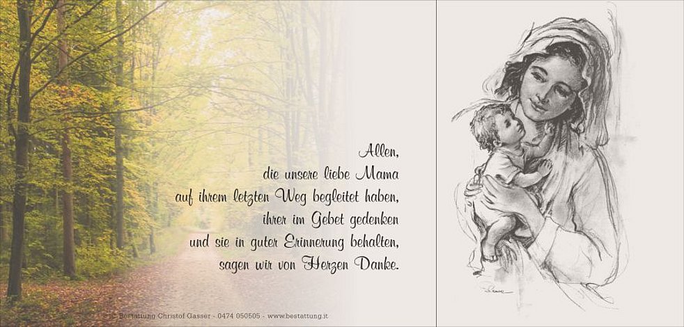 Liebe Mama, du hast mit deinem Lachen uns und anderen viel Freude bereitet und kannst zufrieden auf dein Leben zurückblicken. Deine Fürsorge für uns Kinder werden wir dir immer danken.