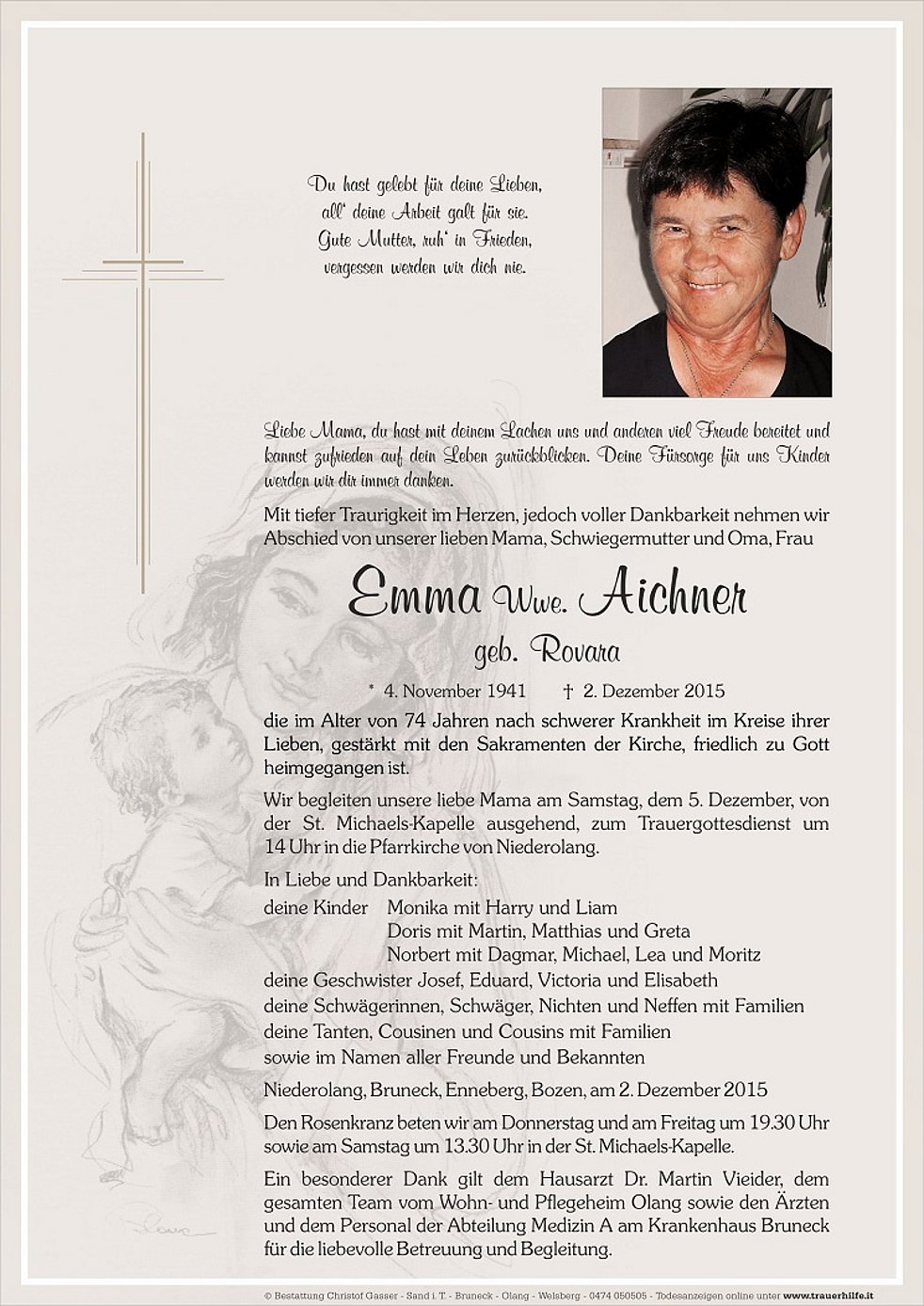 Ein besonderer Dank gilt dem Hausarzt Dr. Martin Vieider, dem gesamten Team vom Wohn- und Pflegeheim Olang sowie den Ärzten und dem Personal der Abteilung Medizin A am Krankenhaus Bruneck für die liebevolle Betreuung und Begleitung.
