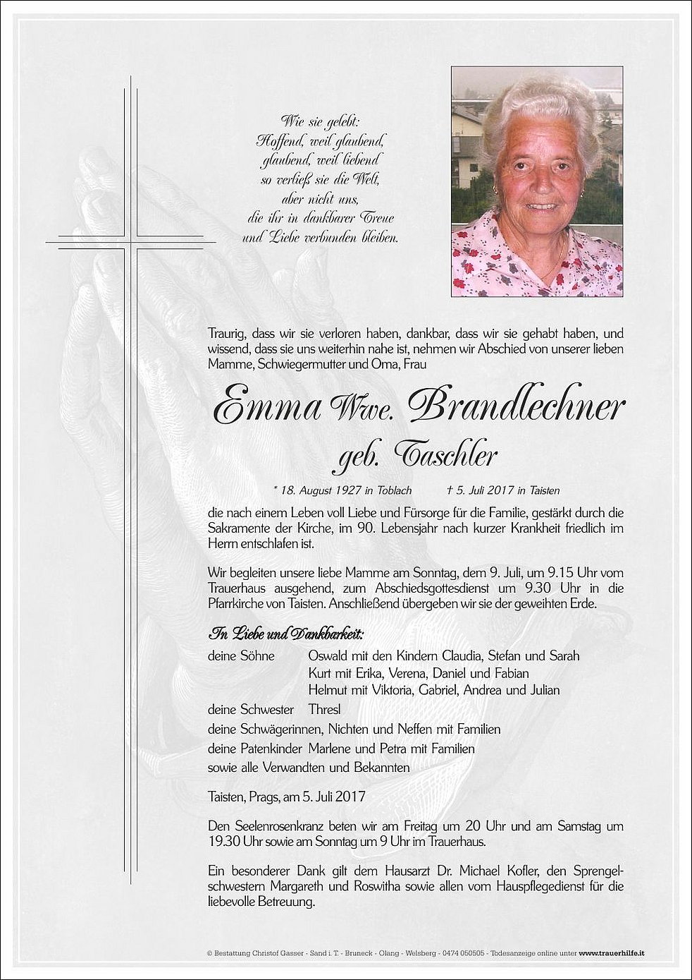 Wir begleiten unsere liebe Mamme am Sonntag, dem 9. Juli, um 9.15 Uhr vom Trauerhaus ausgehend, zum Abschiedsgottesdienst um 9.30 Uhr in die Pfarrkirche von Taisten. Anschließend übergeben wir sie der geweihten Erde.