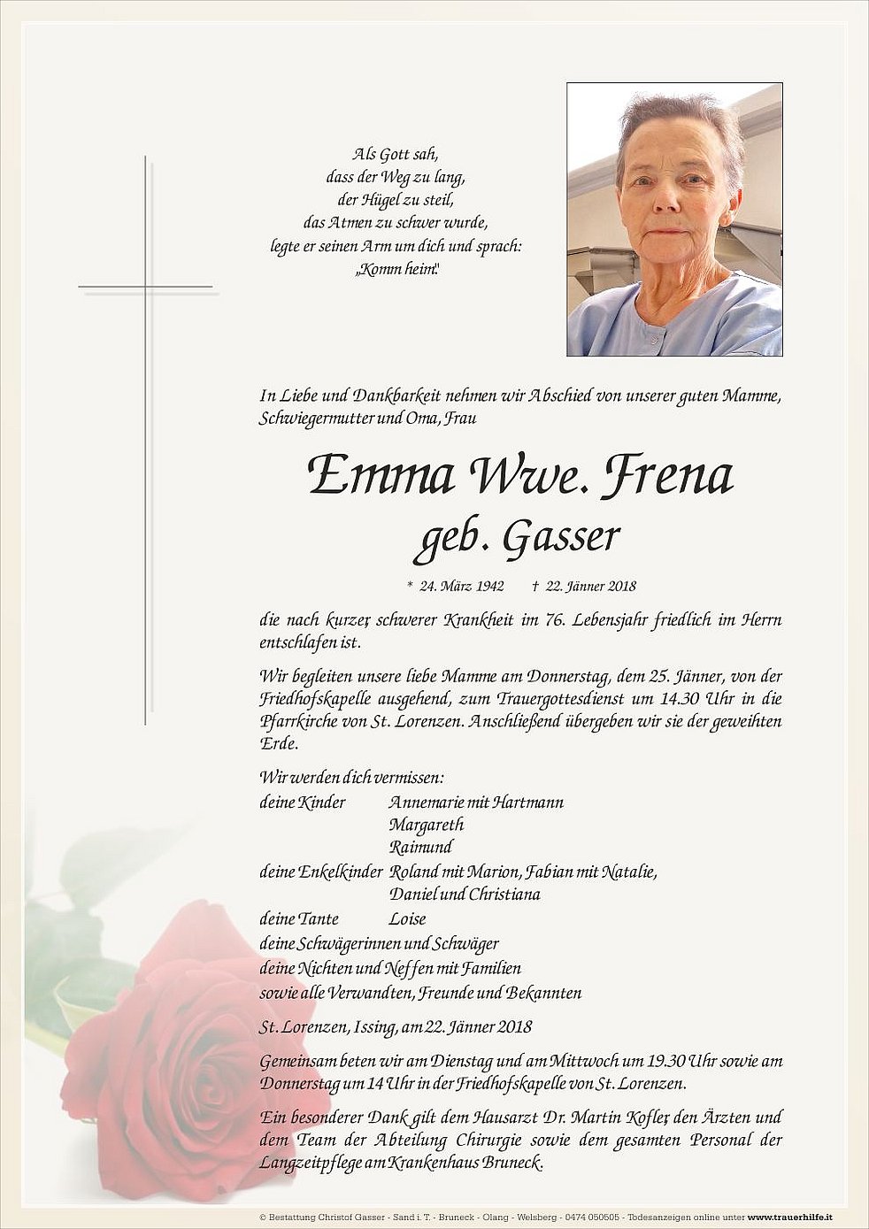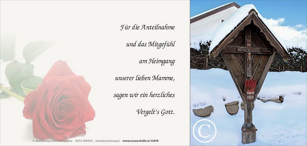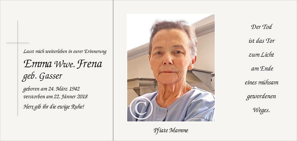 Wir begleiten unsere liebe Mamme am Donnerstag, dem 25. Jänner, von der Friedhofskapelle ausgehend, zum Trauergottesdienst um 14.30 Uhr in die Pfarrkirche von St. Lorenzen. Anschließend übergeben wir sie der geweihten Erde.