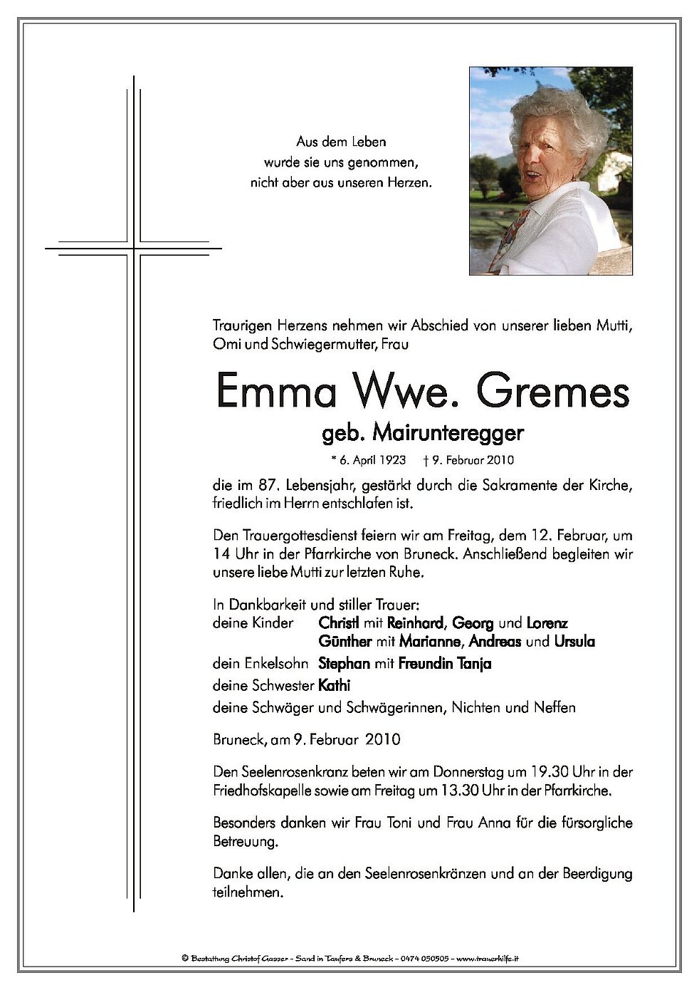 Den Trauergottesdienst feiern wir am Freitag, dem 12. Februar, um 14 Uhr in der Pfarrkirche von Bruneck. Anschließend begleiten wir unsere liebe Mutti zur letzten Ruhe.