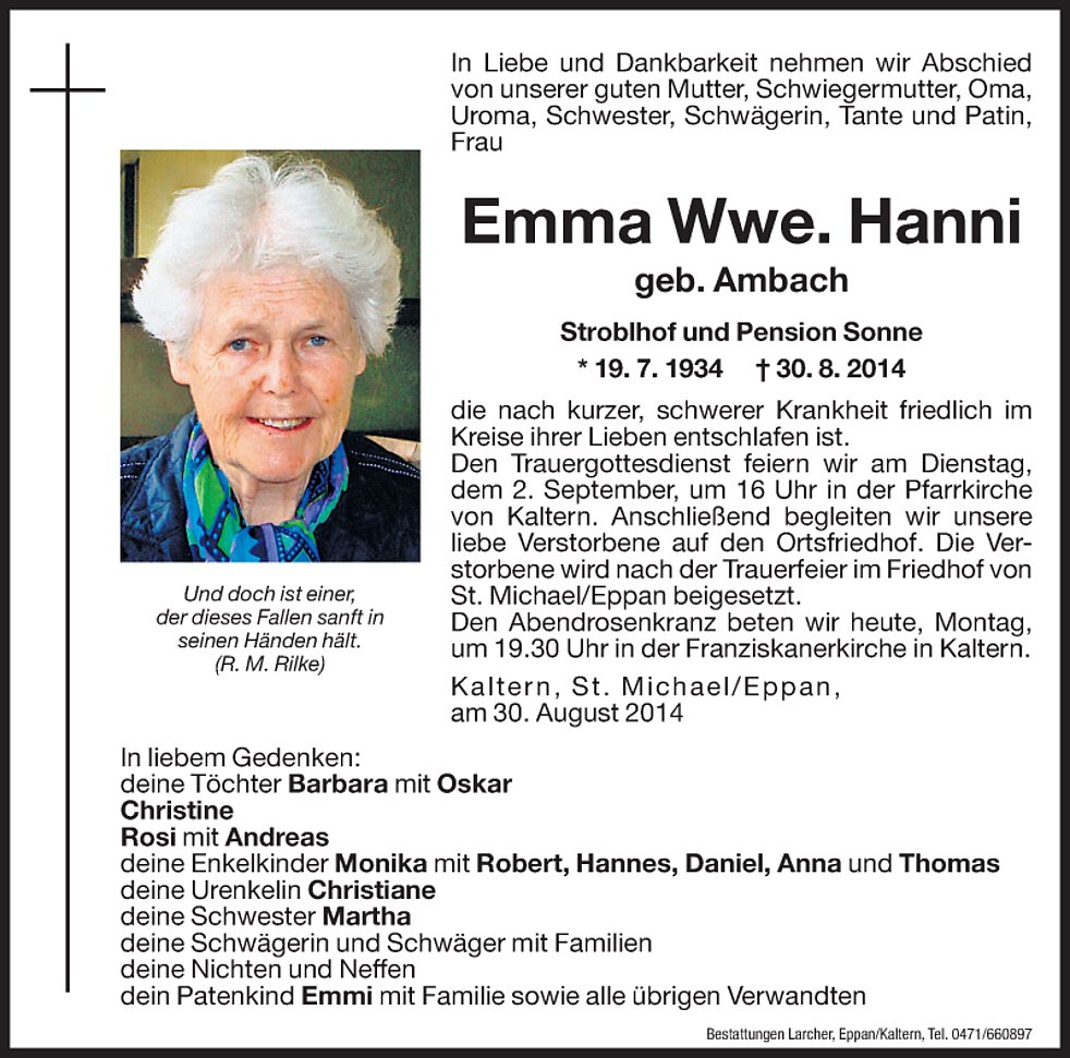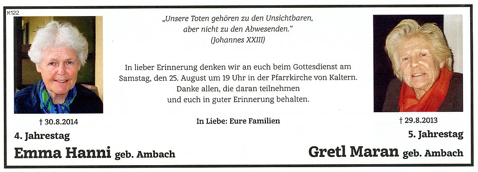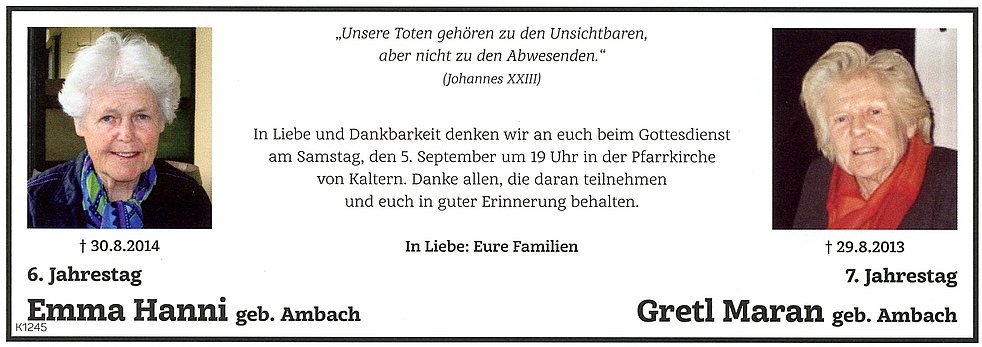 Den Trauergottesdienst feiern wir am Dienstag, dem 2. September, um 16 Uhr in der Pfarrkirche von Kaltern. Anschließend begleiten wir unsere liebe Verstorbene auf den Ortsfriedhof. Die Verstorbene wird nach der Trauerfeier im Friedhof von St. Michael/Eppan beigesetzt.