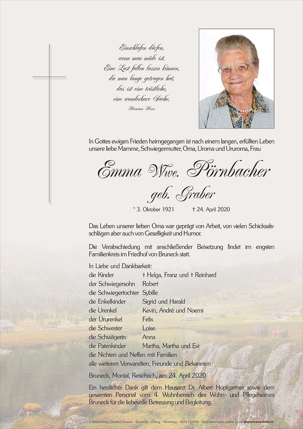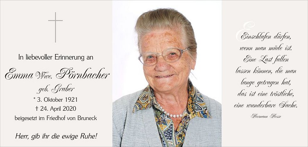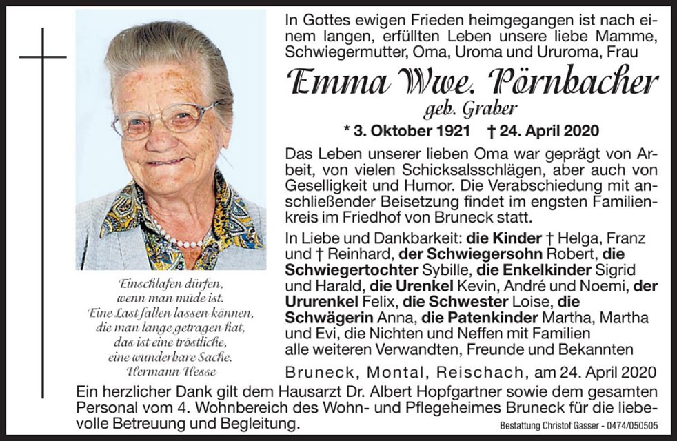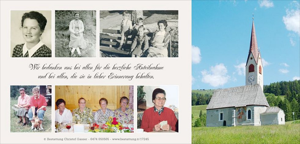 Ein herzlicher Dank gilt dem Hausarzt Dr. Albert Hopfgartner sowie dem gesamten Personal vom 4. Wohnbereich des Wohn- und Pflegeheimes Bruneck für die liebevolle Betreuung und Begleitung.