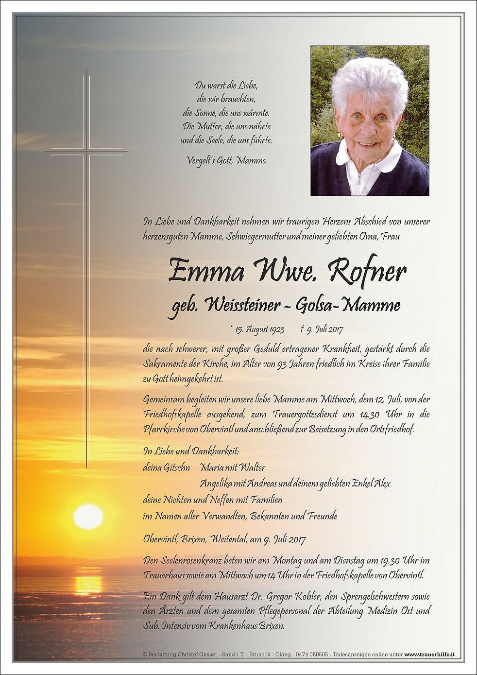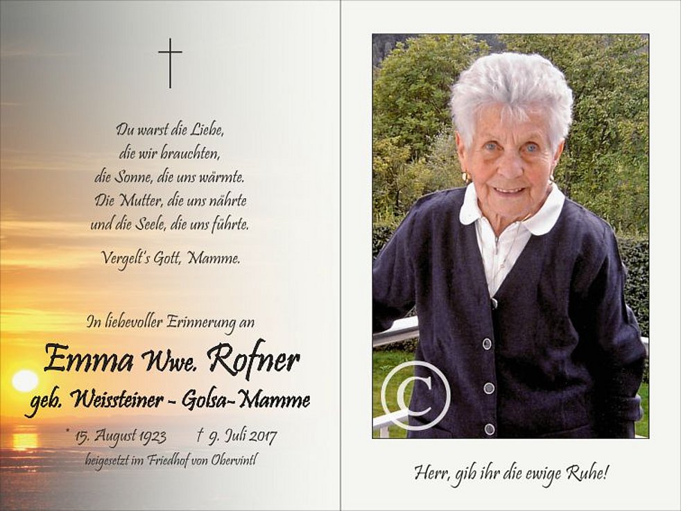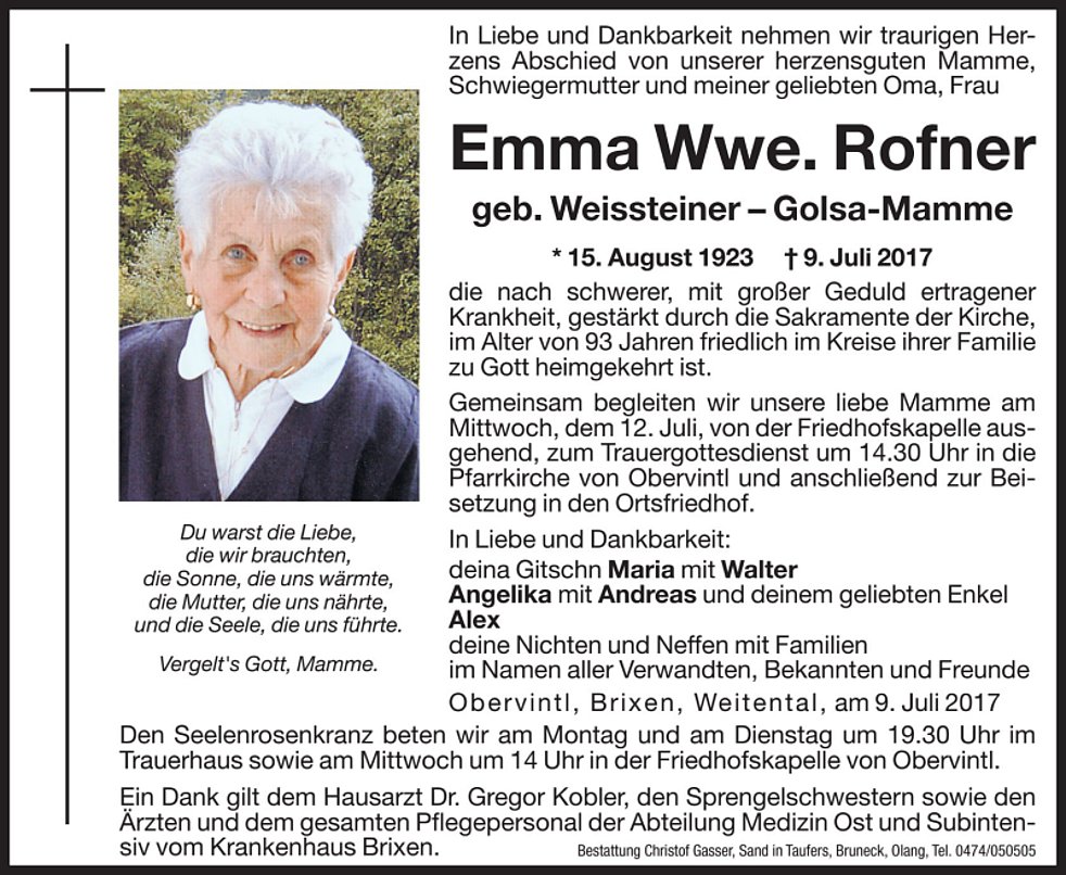 Gemeinsam begleiten wir unsere liebe Mamme am Mittwoch, dem 12. Juli, von der Friedhofskapelle ausgehend, zum Trauergottesdienst um 14.30 Uhr in die Pfarrkirche von Obervintl und anschließend zur Beisetzung in den Ortsfriedhof.