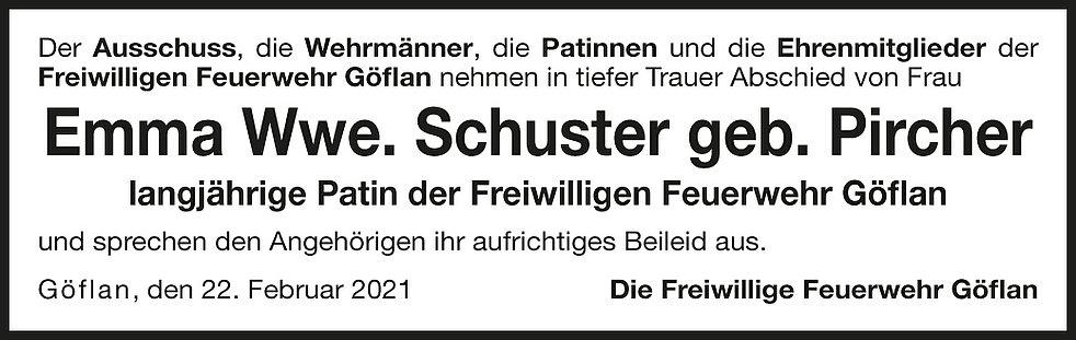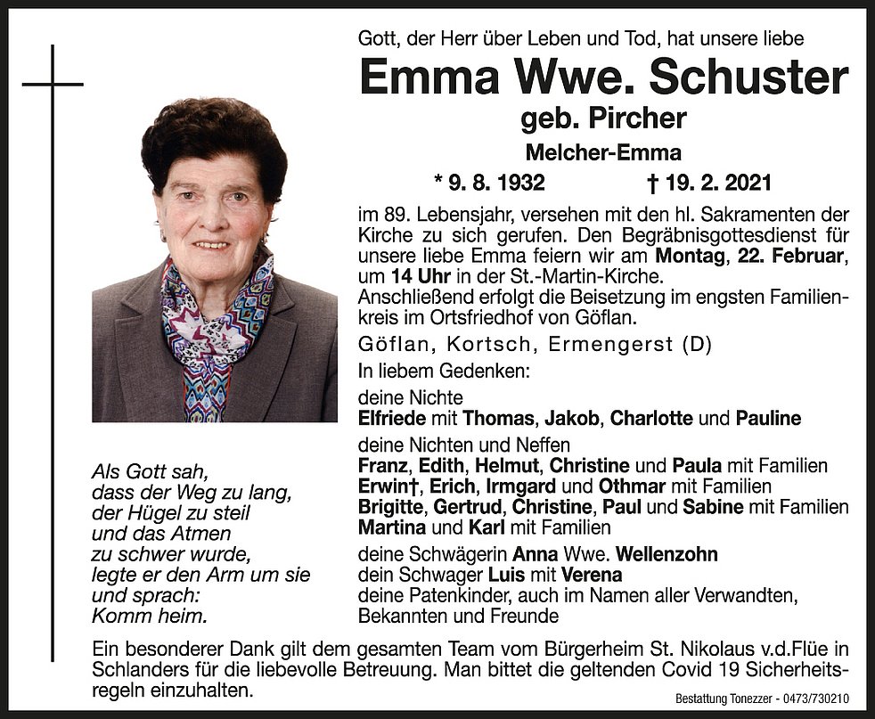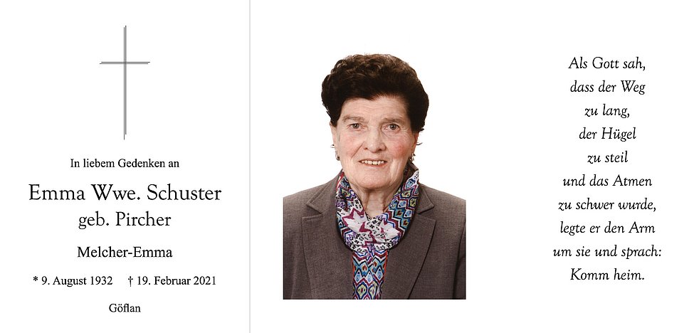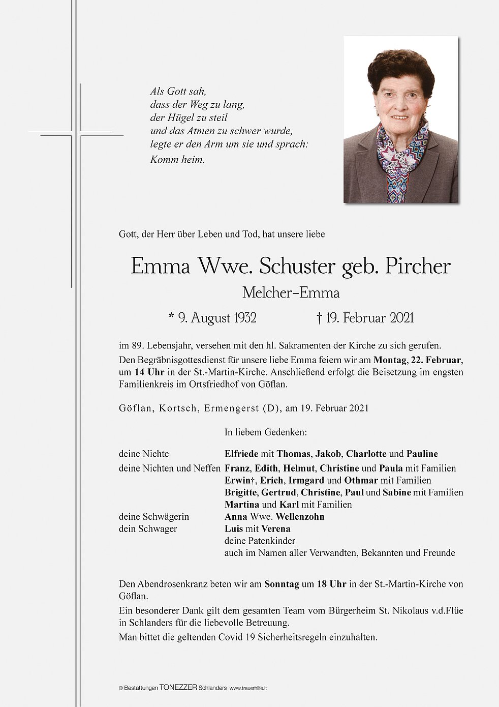 Den Begräbnisgottesdienst für unsere liebe Emma feiern wir am Montag, 22. Februar, um 14 Uhr in der St.-Martin-Kirche.
