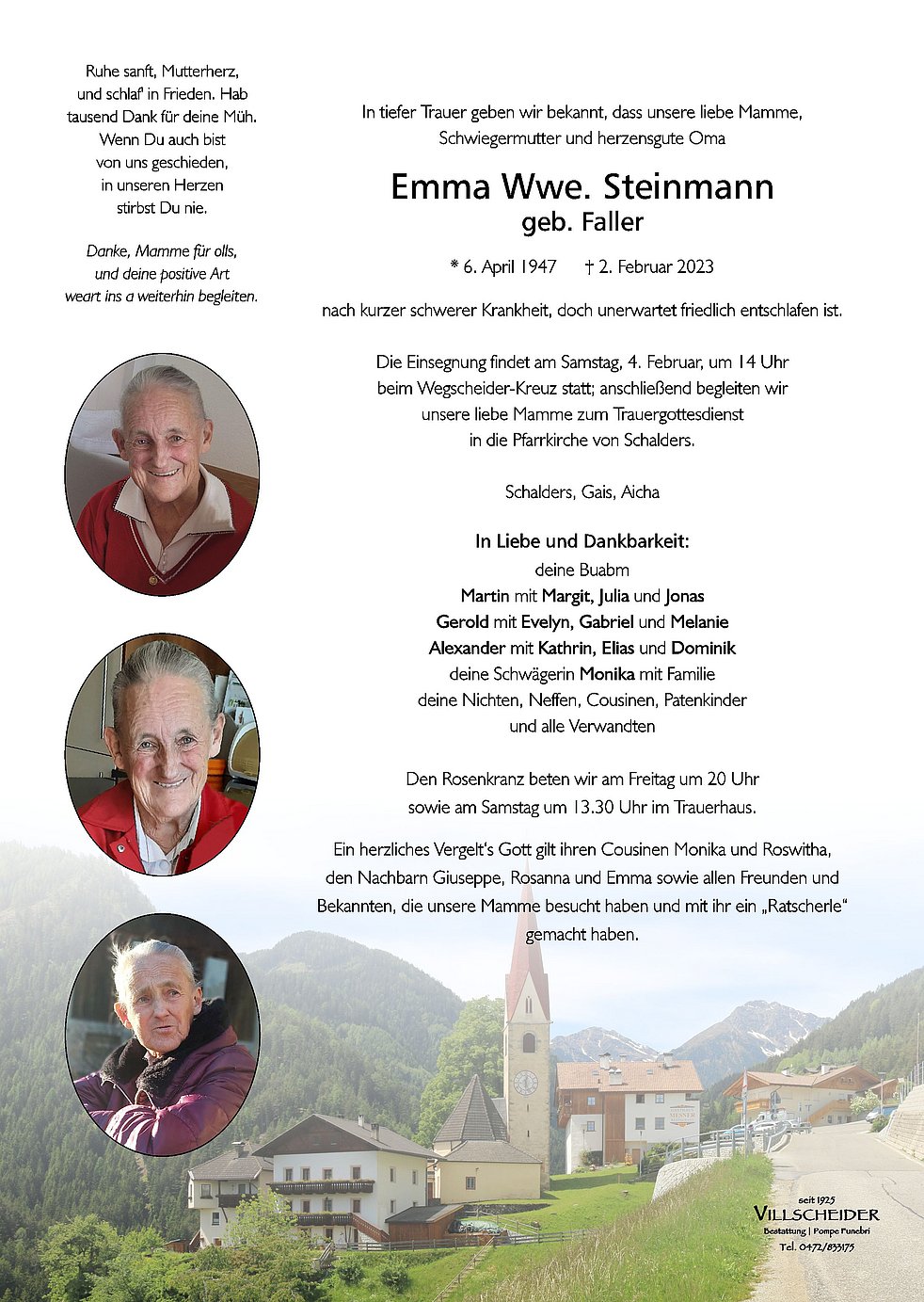 Emma mir wünschn diar no ah guate Reise af dein letschtn Weg Dein lustign Humor wearmor nia vorgessn! Tausnd mol DANKE für olls wos du oft für ins gitun hosch. Ruhe in Friedn liebe Emma Martin, Gerold und Alex mit Familie enk wünschmor viel Kroft in dear Zeit und inser aufrichtiges Beileid.