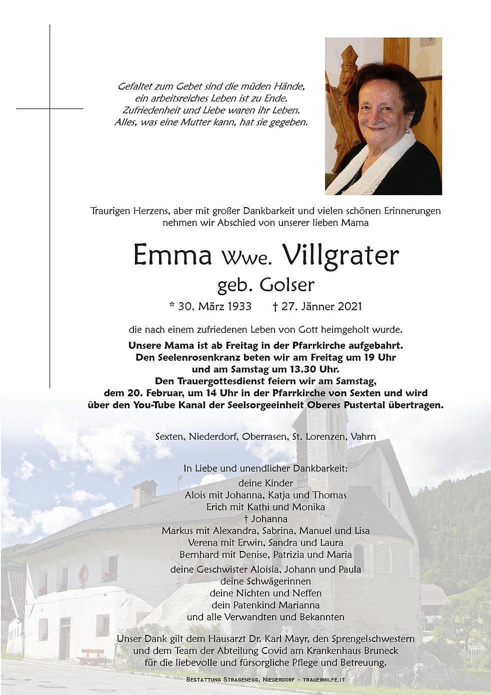 Den Trauergottesdienst feiern wir am Samstag, dem 20. Februar, um 14 Uhr in der Pfarrkirche von Sexten und wird über den You-Tube Kanal der Seelsorgeeinheit Oberes Pustertal übertragen.
