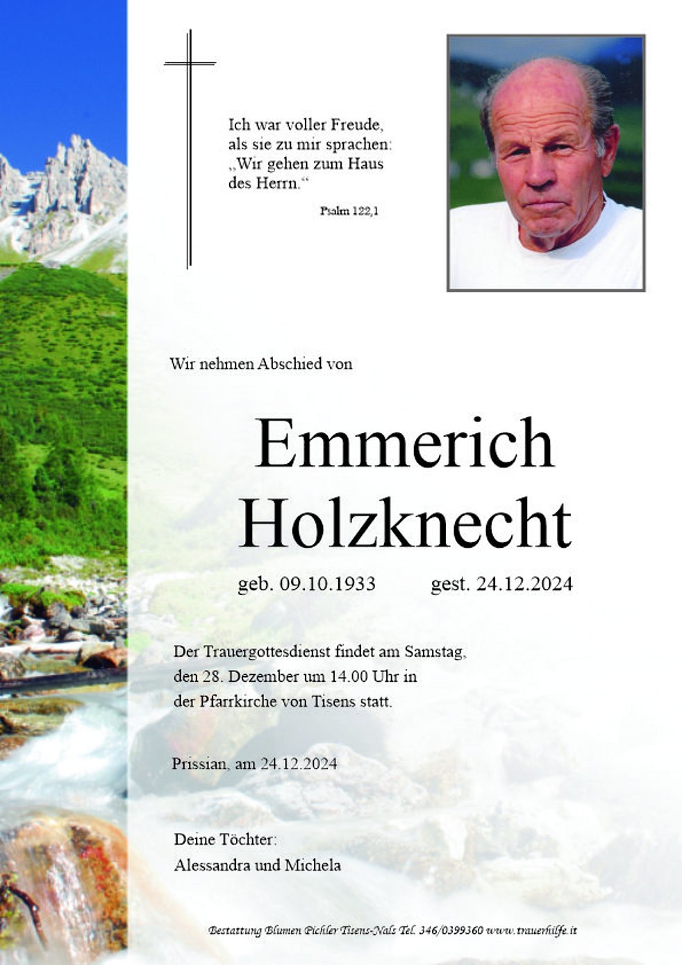Euer lieber Vater, unser Freund Emmerich ist am Heiligen Abend in eine neue Heimat gezogen. Schmerzerfüllt haben wir die Nachricht aufgenommen. Ein Leben lang hat er sich der Kunst verschrieben und viel, viel Wertvolles geschaffen, was freie und sakrale Kunst hervorbringen kann. Seine Skulpturen und die Malereien und Skizzen, seine Bilder aus fernen Kontinenten, werden uns ewig an ihn erinnern. Nun ist er in einen Kontinent gezogen, der weiter entfernt ist als Amerika und Australien. Doch Emmerich wird immer in unserer Nähe bleiben, denn wo wir sind, ist auch er.