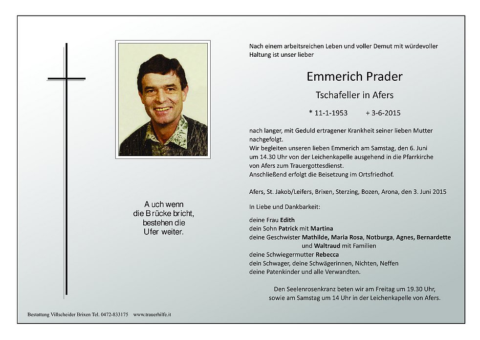 sowie am Samstag um 14 Uhr in der Leichenkapelle von Afers.