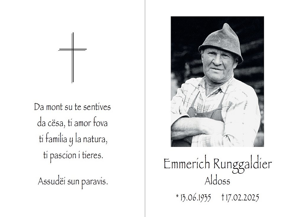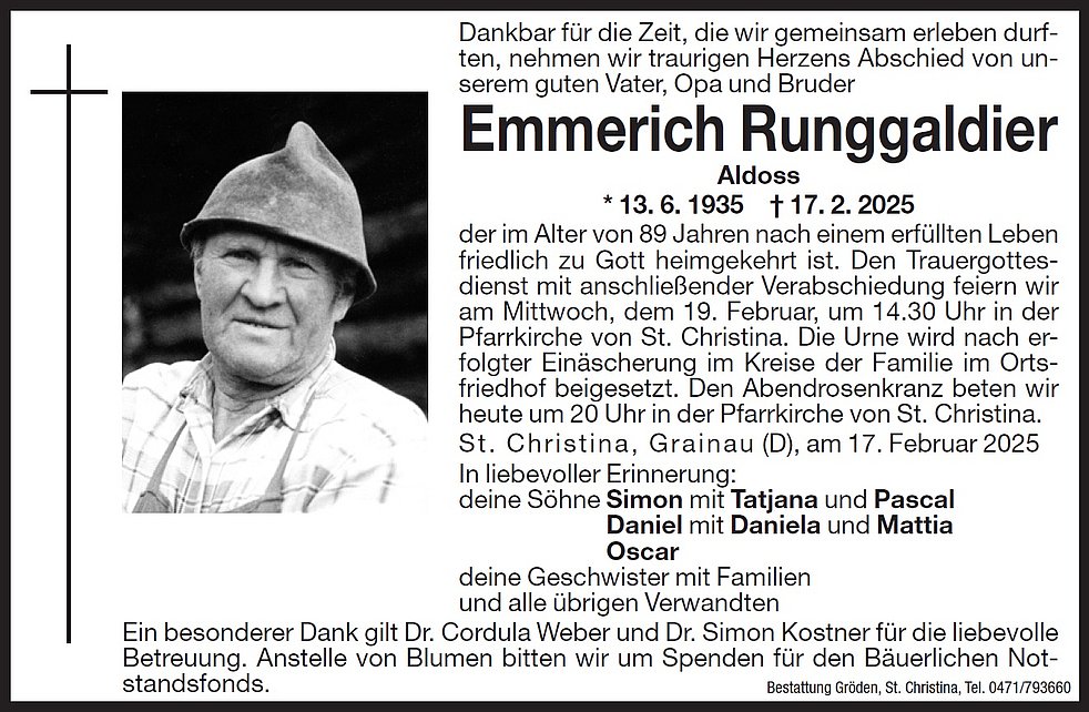 Den Trauergottesdienst mit anschließender Verabschiedung feiern wir am Mittwoch, dem 19. Februar, um 14.30 Uhr in der Pfarrkirche von St. Christina. Die Urne wird nach erfolgter Einäscherung im Kreise der Familie im Ortsfriedhof beigesetzt.