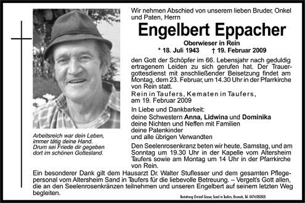 Der Sterbegottesdienst, mit anschließender Beisetzung, findet am Montag, dem 23. Februar, um 14.30 Uhr in der Pfarrkirche von Rein statt.