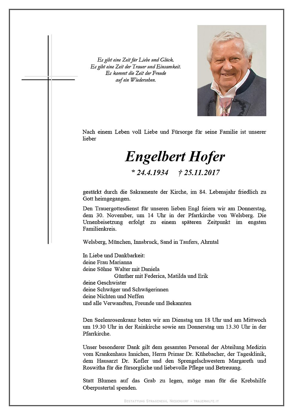 Den Trauergottesdienst für unseren lieben Engl feiern wir am Donnerstag, dem 30. November, um 14 Uhr in der Pfarrkirche von Welsberg. Die Urnenbeisetzung erfolgt zu einem späteren Zeitpunkt im engsten Familienkreis.