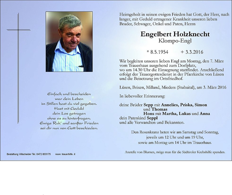 Anstelle von Blumen, möge man für die Südtiroler Krebshilfe spenden.