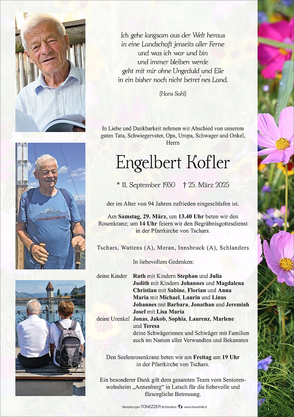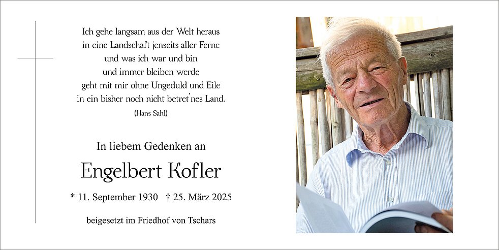 Begräbnisgottesdienst: 29.03. - 14:00 Uhr Pfarrkirche Tschars