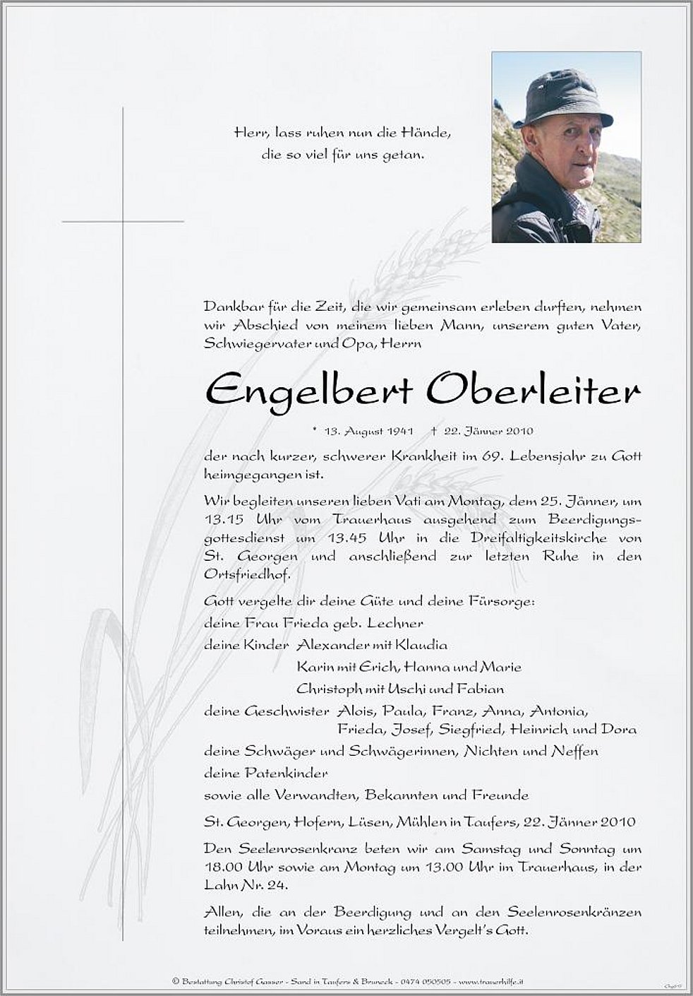 Wir begleiten unseren lieben Vati am Montag, dem 25. Jänner, um 13.15 Uhr vom Trauerhaus ausgehend zum Beerdigungs-gottesdienst um 13.45 Uhr in die Dreifaltigkeitskirche von