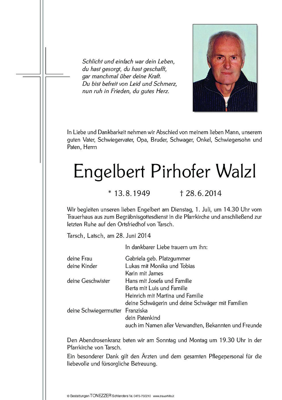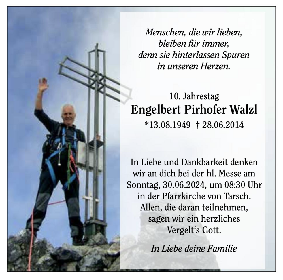 Schlicht und einfach war dein Leben, du hast gesorgt, du hast geschafft, gar manchmal über deine Kraft. Du bist befreit von Leid und Schmerz, nun ruh in Frieden, du gutes Herz. In Liebe und Dankbarkeit nehmen wir Abschied von meinem lieben Mann, unserem guten Vater, Schwiegervater, Opa, Bruder, Schwager, Onkel, Schwiegersohn und Paten, Herrn Engelbert Pirhofer Walzl * 13.8.1949 † 28.6.2014 Wir begleiten unseren lieben Engelbert am Dienstag, 1. Juli, um 14.30 Uhr vom Trauerhaus aus zum Begräbnisgottesdienst in die Pfarrkirche und anschließend zur letzten Ruhe auf den Ortsfriedhof von Tarsch. Tarsch, Latsch, am 28. Juni 2014 In dankbarer Liebe trauern um ihn: deine Frau Gabriela geb. Platzgummer deine Kinder Lukas mit Monika und Tobias Karin mit James deine Geschwister Hans mit Josefa und Familie Berta mit Luis und Familie Heinrich mit Martina und Familie deine Schwägerin und deine Schwäger mit Familien deine Schwiegermutter Franziska dein Patenkind auch im Namen aller Verwandten, Bekannten und Freunde Den Abendrosenkranz beten wir am Sonntag und Montag um 19.30 Uhr in der Pfarrkirche von Tarsch. Ein besonderer Dank gilt den Ärzten und dem gesamten Pflegepersonal für die liebevolle und fürsorgliche Betreuung.