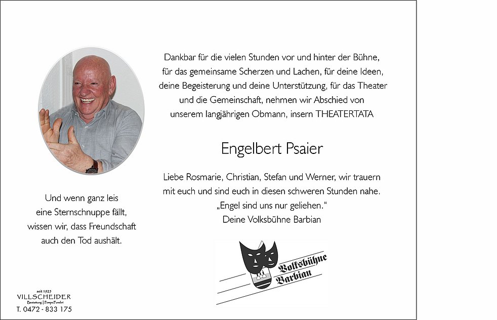 Viel zu früh hast du nun die Lebensbühne verlassen und hinterlässt eine große Lücke in der Dorfgemeinschaft. Barbian trägt Trauer.