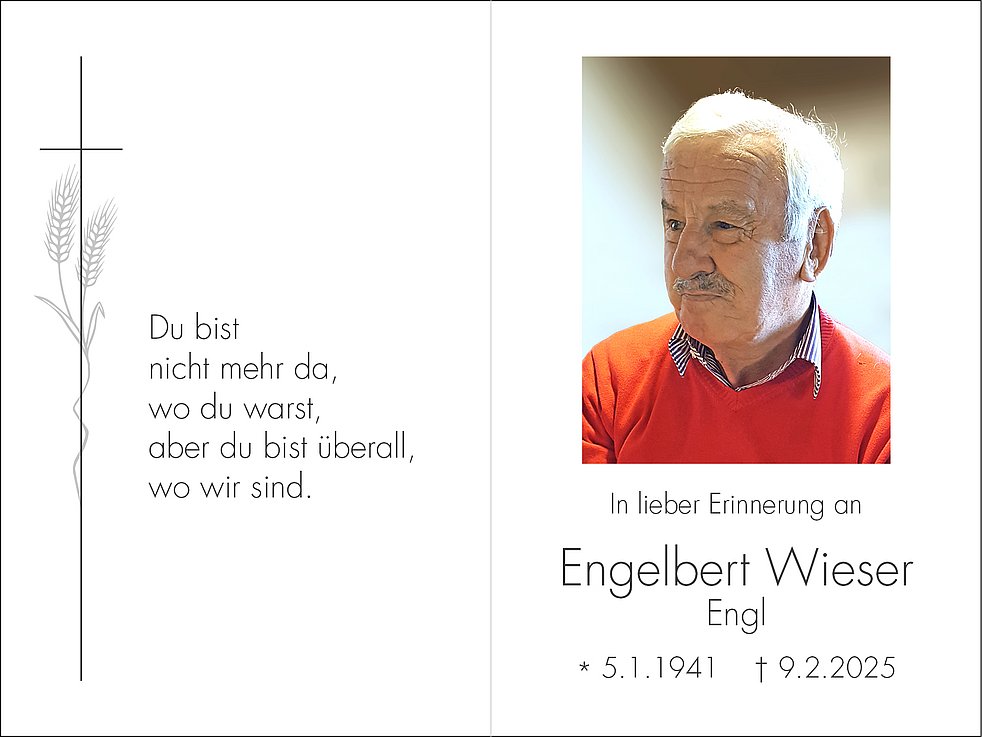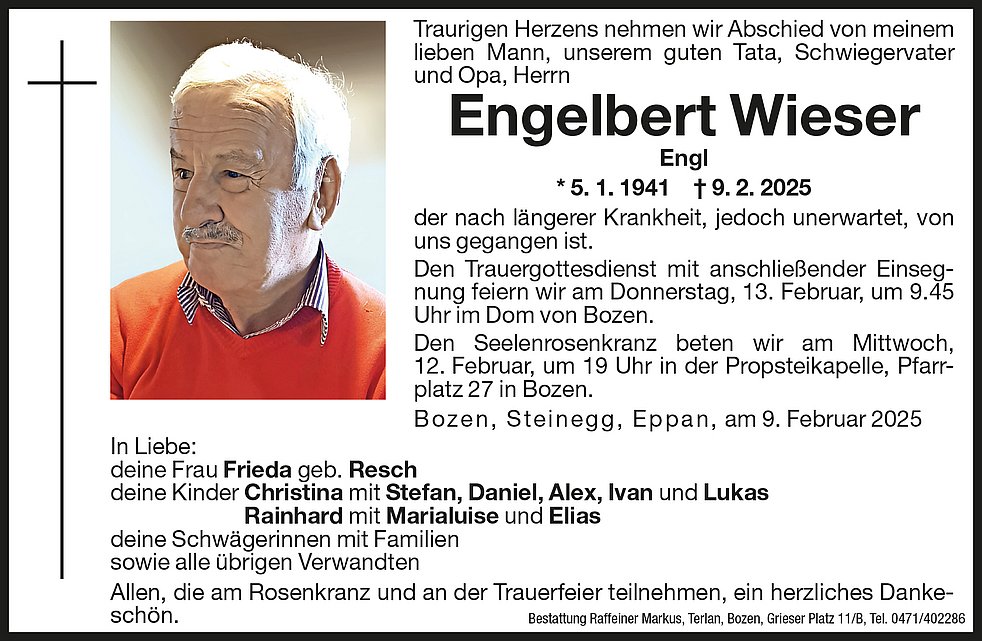 Den Trauergottesdienst mit anschließender Einsegnung feiern wir am Donnerstag, 13. Februar, um 9.45 Uhr im Dom von Bozen.