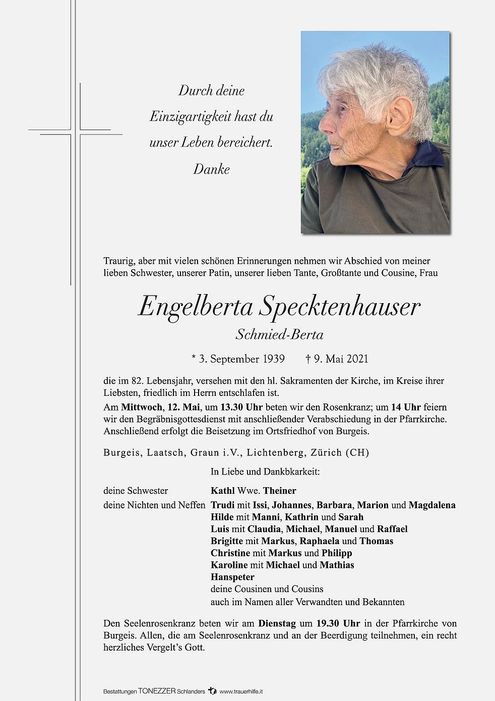 Am Mittwoch, 12. Mai, um 13.30 Uhr beten wir den Rosenkranz; um 14 Uhr feiern wir den Begräbnisgottesdienst mit anschließender Verabschiedung in der Pfarrkirche.